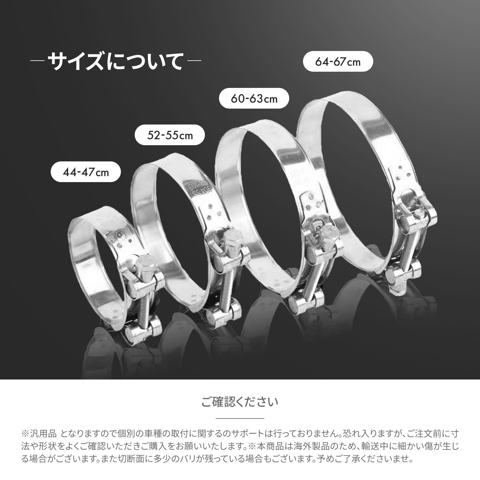 マフラー バンド ステンレスのサイズ:44-47mm 52-55mm 60-63mm 64-67mmの4サイズをご用意しております。