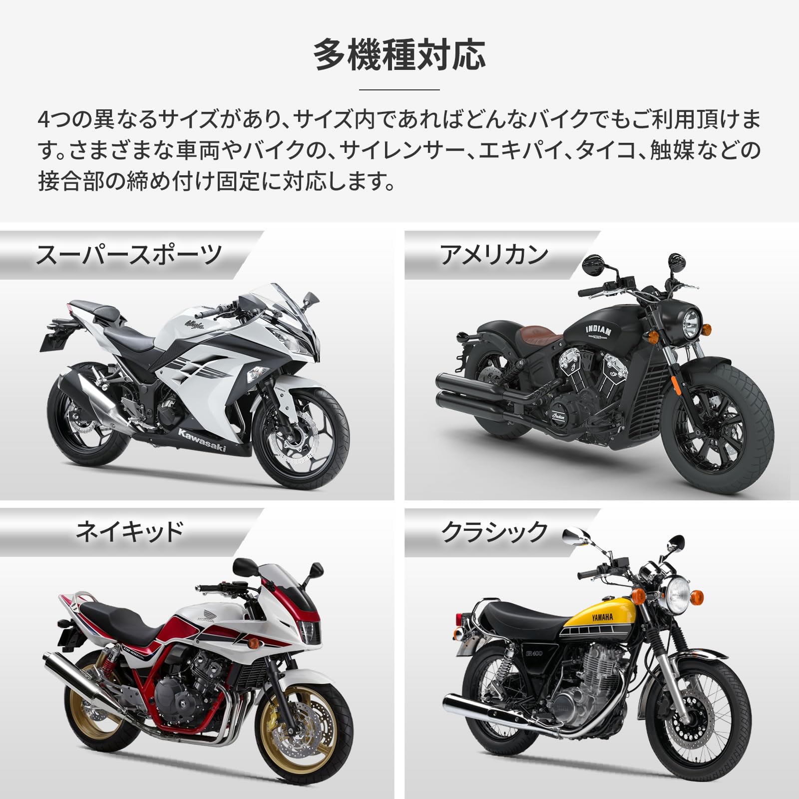 マフラーバンド ステンレスは様々なバイクに対応:マフラー バンドは4つの異なるサイズがあり、さまざまな車両やバイクの、サイレンサー エキパイ タイコ 触媒などの接合部の締め付け固定に対応します。また、ホース バンド ステンレス バンド サイレンサーバンドなどにも。ユニバーサルなデザインでありながら、確実な固定を実現します。簡単な取り付けで、幅広い需要に対応します。