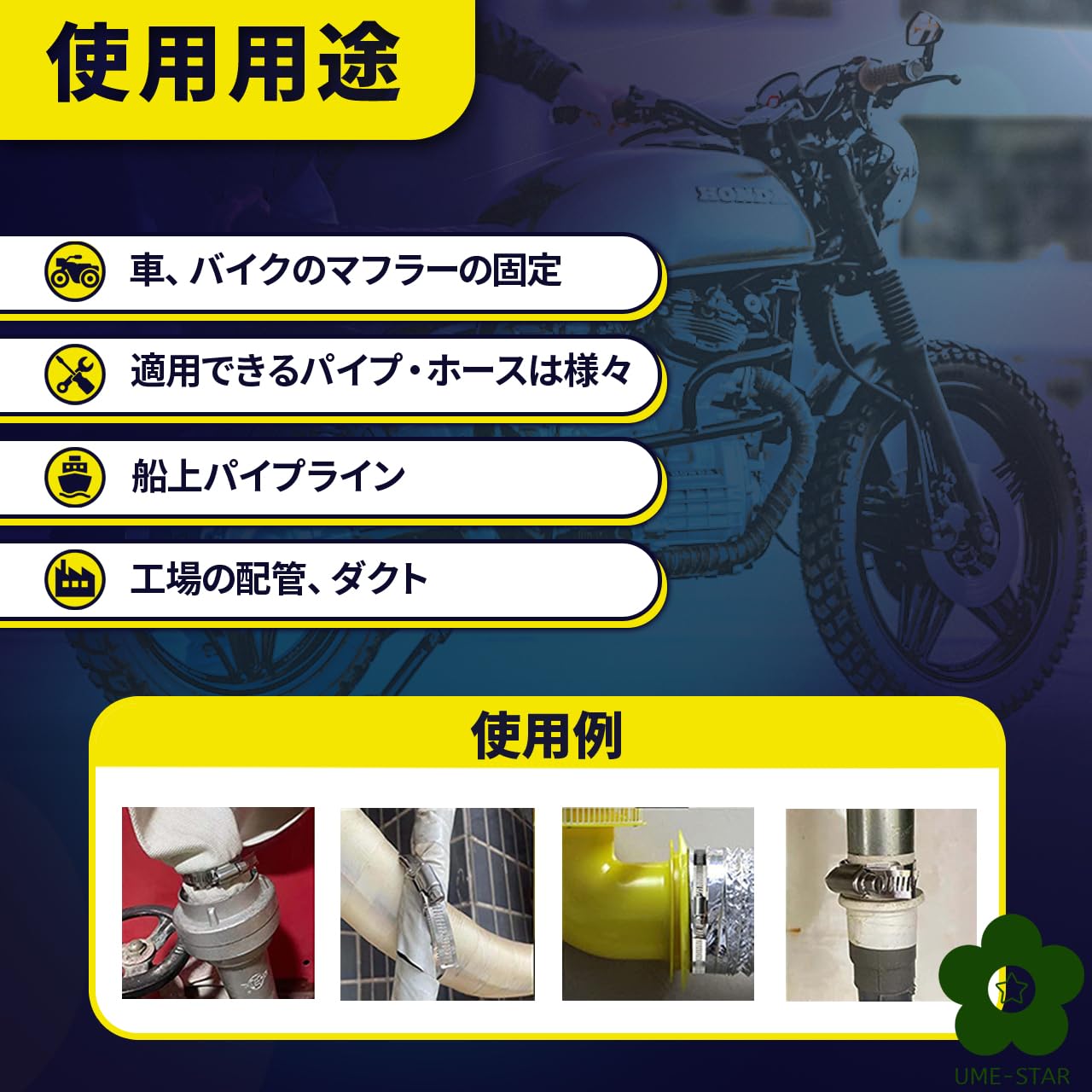 車、バイクや工場の配管、お店や工場のダクト、船上パイプラインなど適用できるパイプ、ホースやダクトは様々です。柱にライトや監視カメラなどを固定したり、車、バイクのマフラーを固定したりすることも可能です。