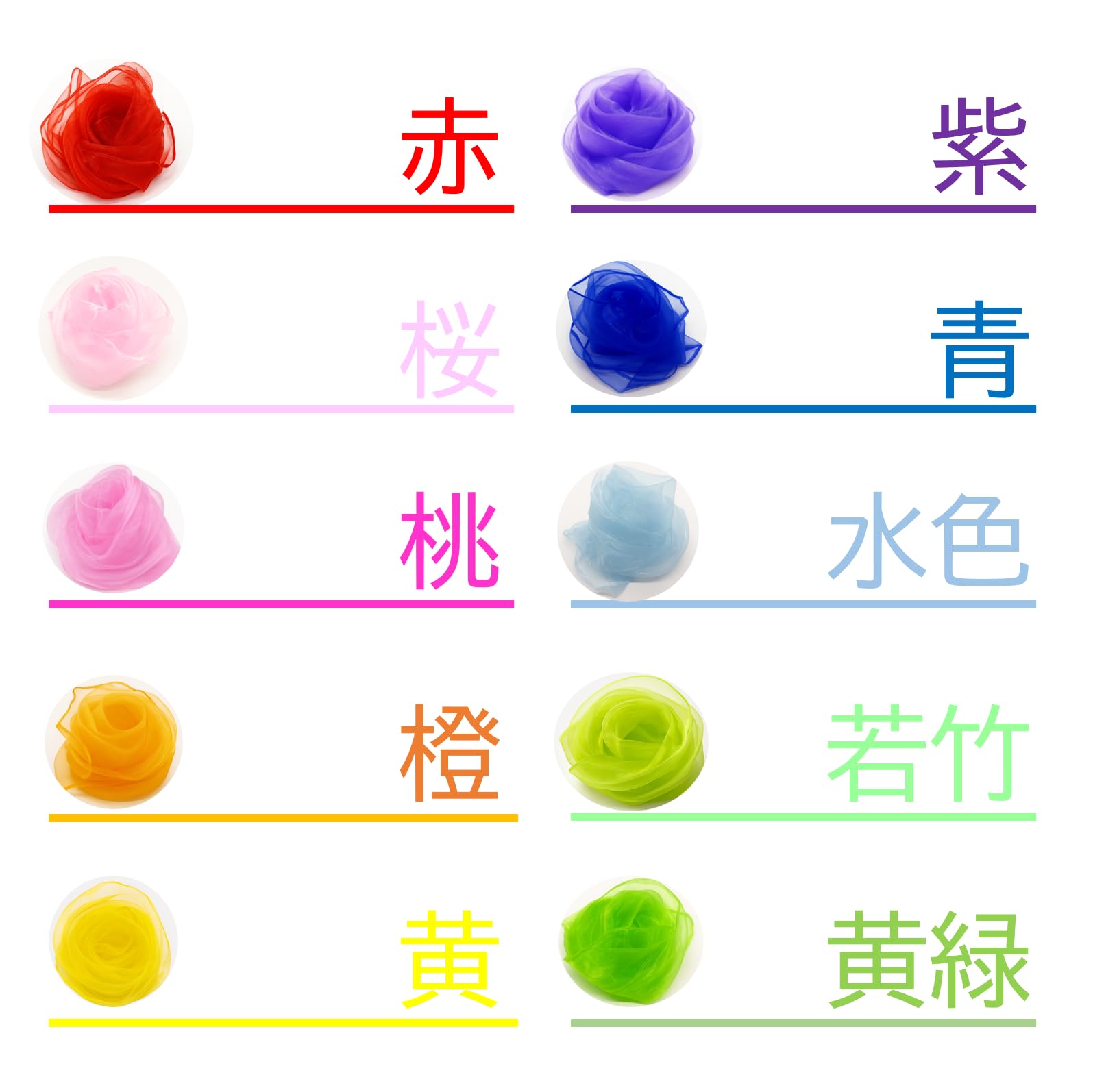 カラー展開 赤・桜・桃・橙・黄・紫・青・水色・若竹・黄緑(10色)