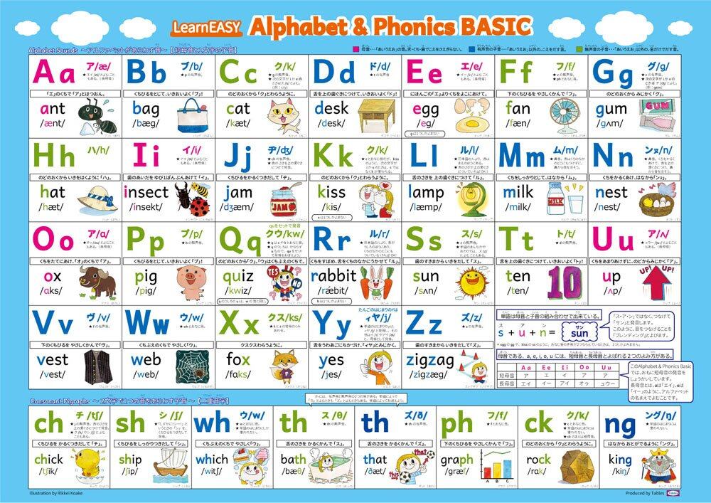 アルファベット26文字と二重音字のフォニックスが学べる。発音記号付き。