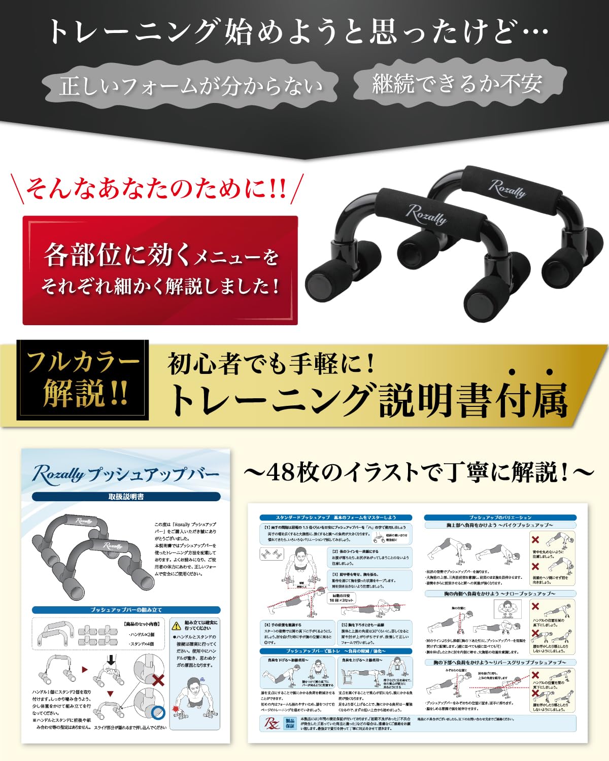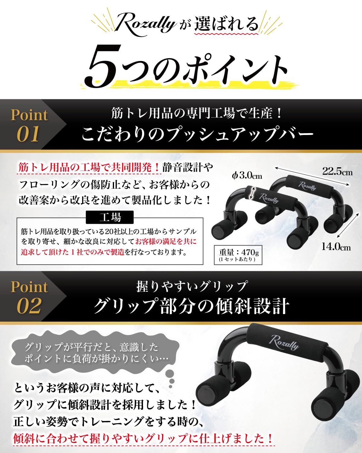 【こだわり】様々なメーカーから” プッシュアップバー ”が販売されていますが、Rozallyの プッシュアップ バー は”掴みやすい傾斜”と”静音設計”が一味違います。 トレーニング用品 や ダイエット用品 をメインに取り扱っている10社以上の工場からサンプルを取り寄せ、強度と形状を一緒に試行錯誤して頂けた1社に絞って発注を行なっています。家トレ で 胸筋 をしっかり鍛えるアイテムとして コンパクト かつ 簡単組み立ての 筋トレ グッズ になります。