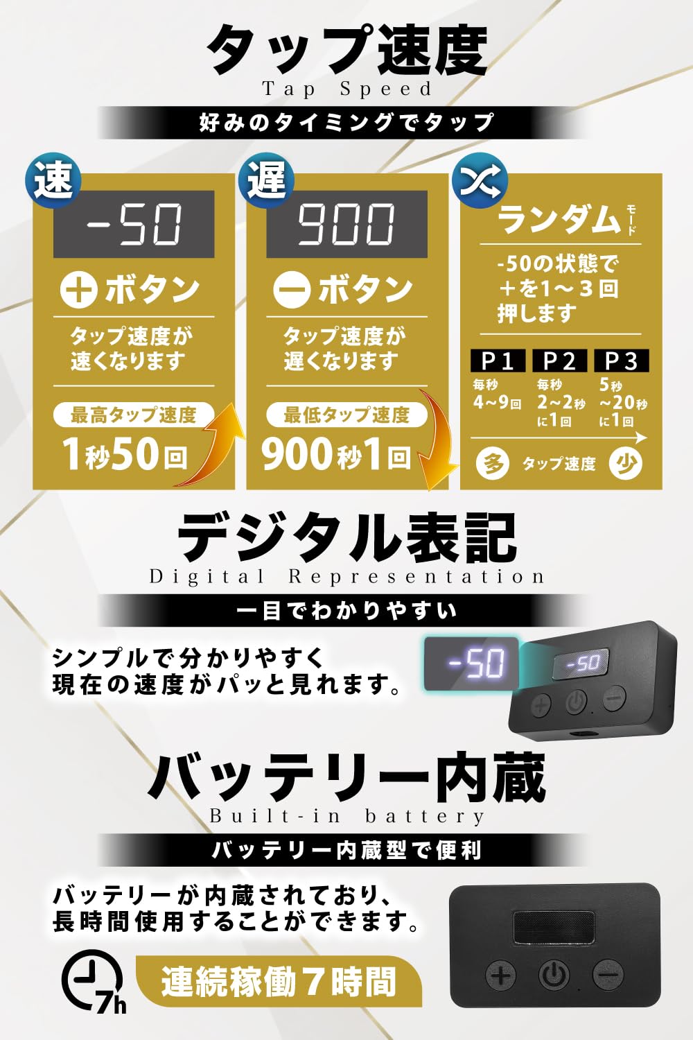 ??この最新連打装置は「タップスピード調整モード」を搭載し、タップ速度をお好みに合わせて調節できます。秒速50回という圧倒的なタップ速度に加え、タップスピードを遅くするモードも新たに追加されました。さらに、ランダムタップモードも完備しており、タップ速度は本体のデジタル表示で一目で確認可能です。