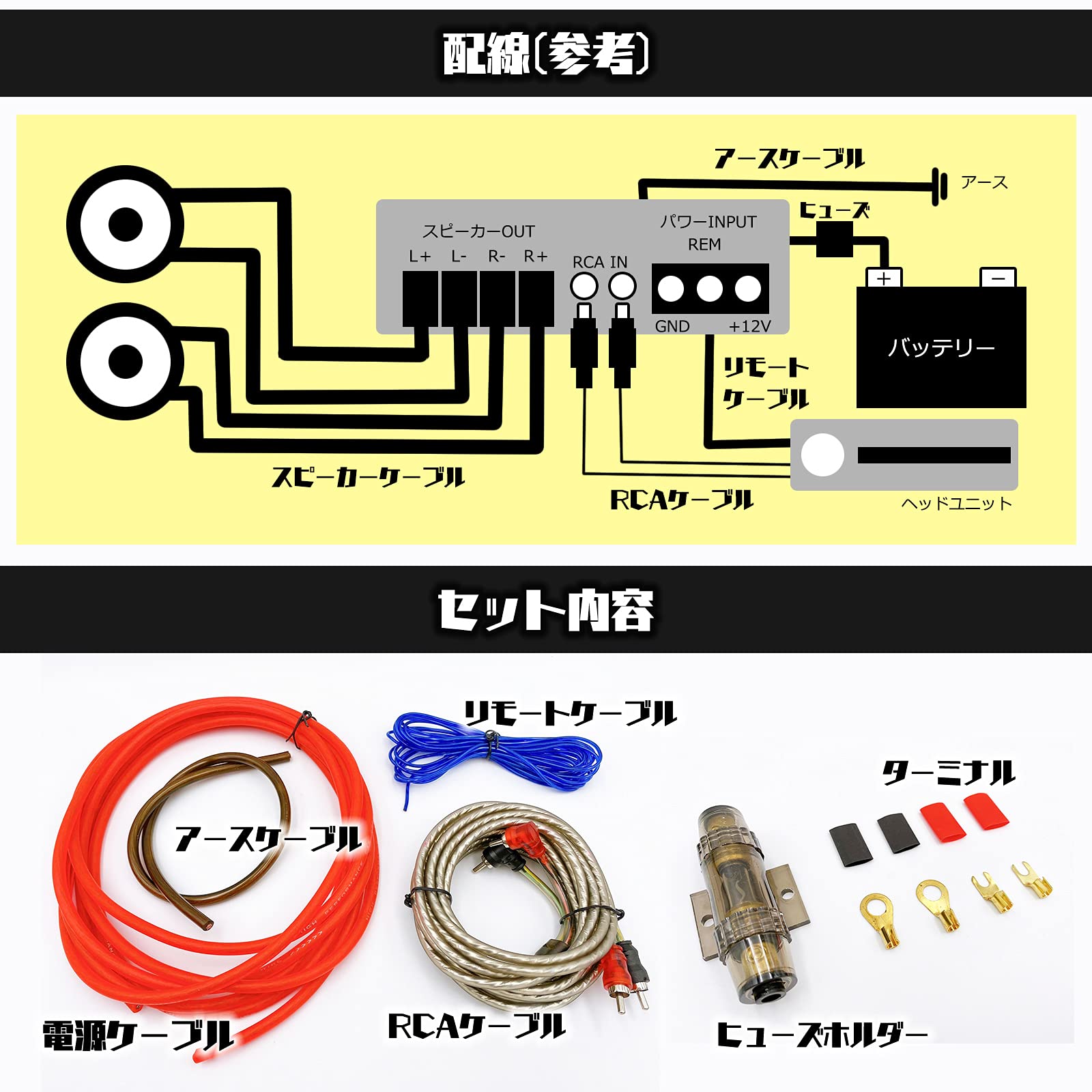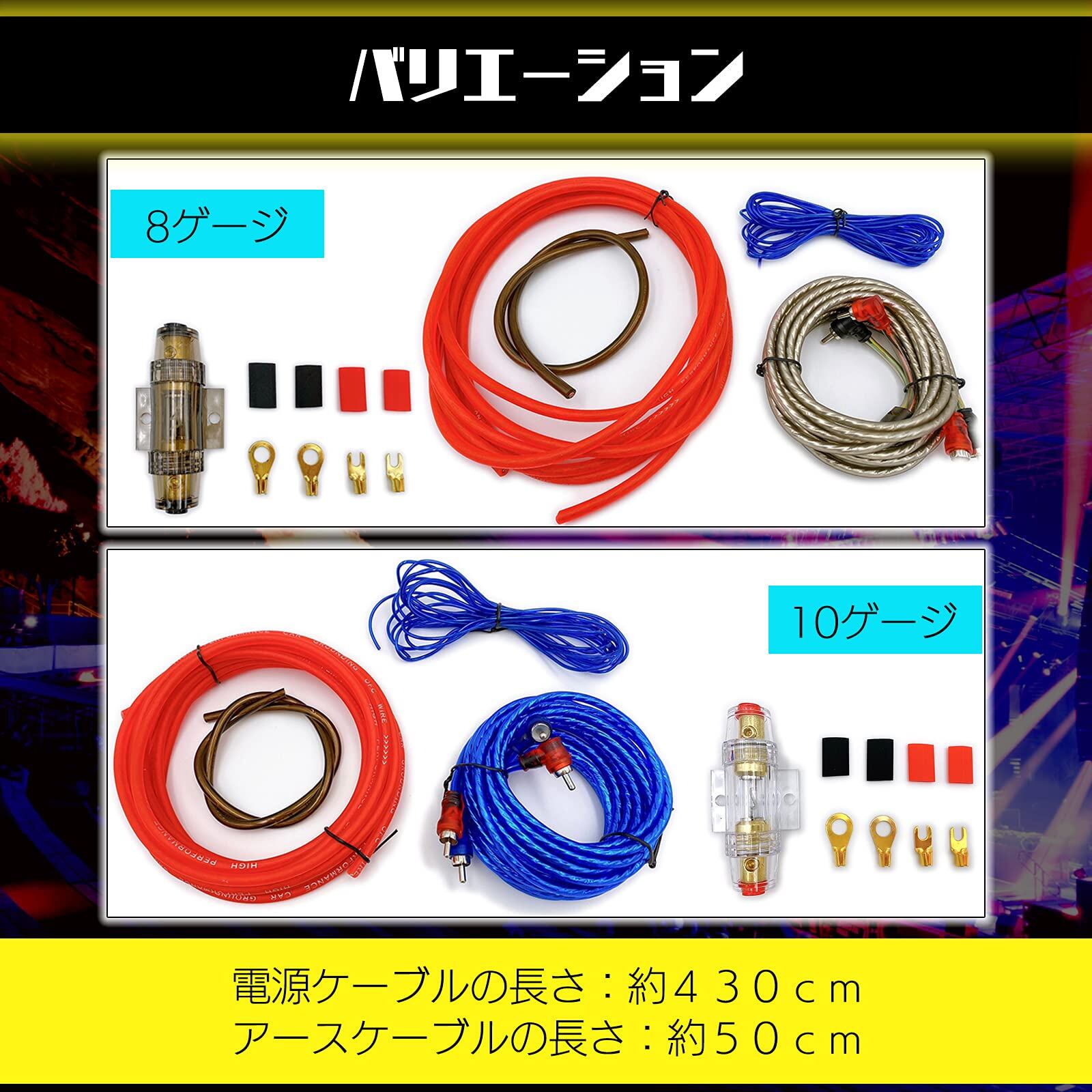 セット内容 【10ゲージ】 ・電源ケーブル (約430cm) ・アースケーブル (約50cm) ・リモートケーブル (約430cm) ・RCAケーブル (約450cm) ・平端子×2、丸端子×2、ゴムキャップ×4 【8ゲージ】 ・電源ケーブル (約430cm) ・アースケーブル (約50cm) ・RCAケーブル (約450cm) ・リモートワイヤー (約450cm) ・平端子×2、丸端子×2、ゴムキャップ×4