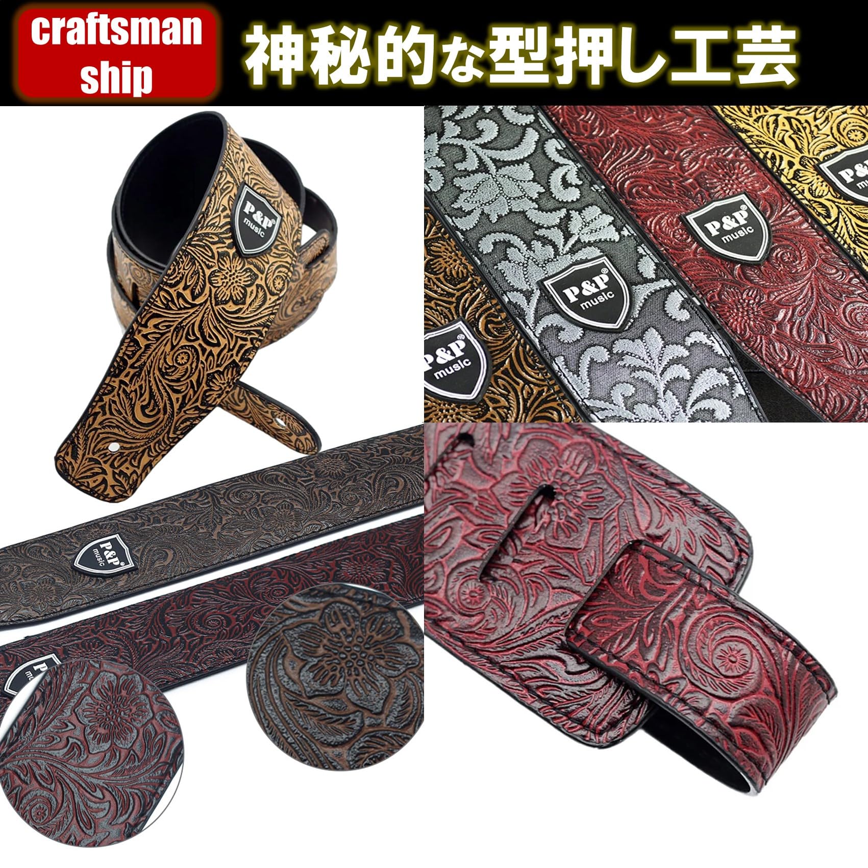 美しい彫刻風の花模様は、専門のクラフトマンが一つ一つのストラップを、まるでカービングの様に丁寧かつ繊細に型押し工芸で製作しております。バリエーションごとに違った魅力のある花柄が神秘的でオリジナリティ溢れるギターストラップです。