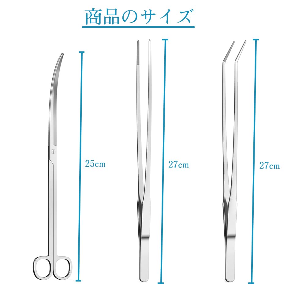 【セット内容】ストレートピンセット(27cm)、カーブピンセット(27cm)、カーブハサミ(25cm)また、持ち運び便利な専用収納バッグも付きます。
