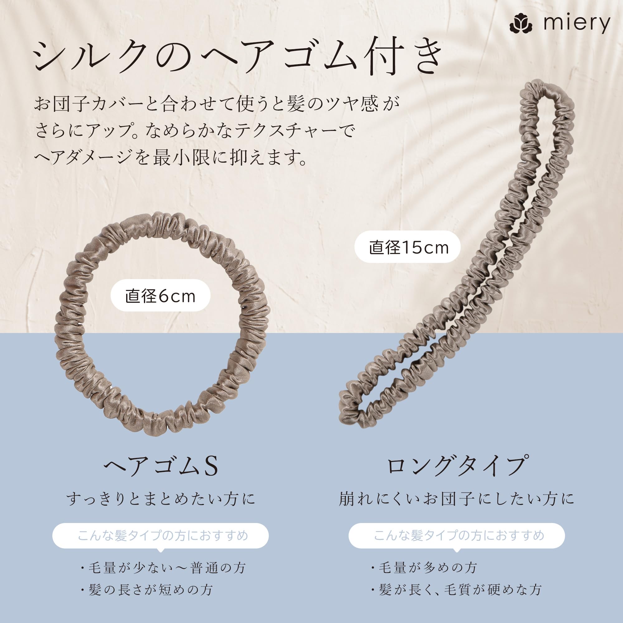 【商品仕様】○サイズ:お団子カバー/直径12cm シルクヘアゴム(Sサイズ)/直径6cm シルクヘアゴム(ロングタイプ)/直径15cm ○セット内容:Aセット(お団子カバー本体、シルクヘアゴム(Sサイズ)) Bセット(お団子カバー本体、シルクヘアゴム(ロングタイプ)) ○カラー:カーキ/ブラック/ネイビー ○素材:天然シルク100% ○ブランド:miery