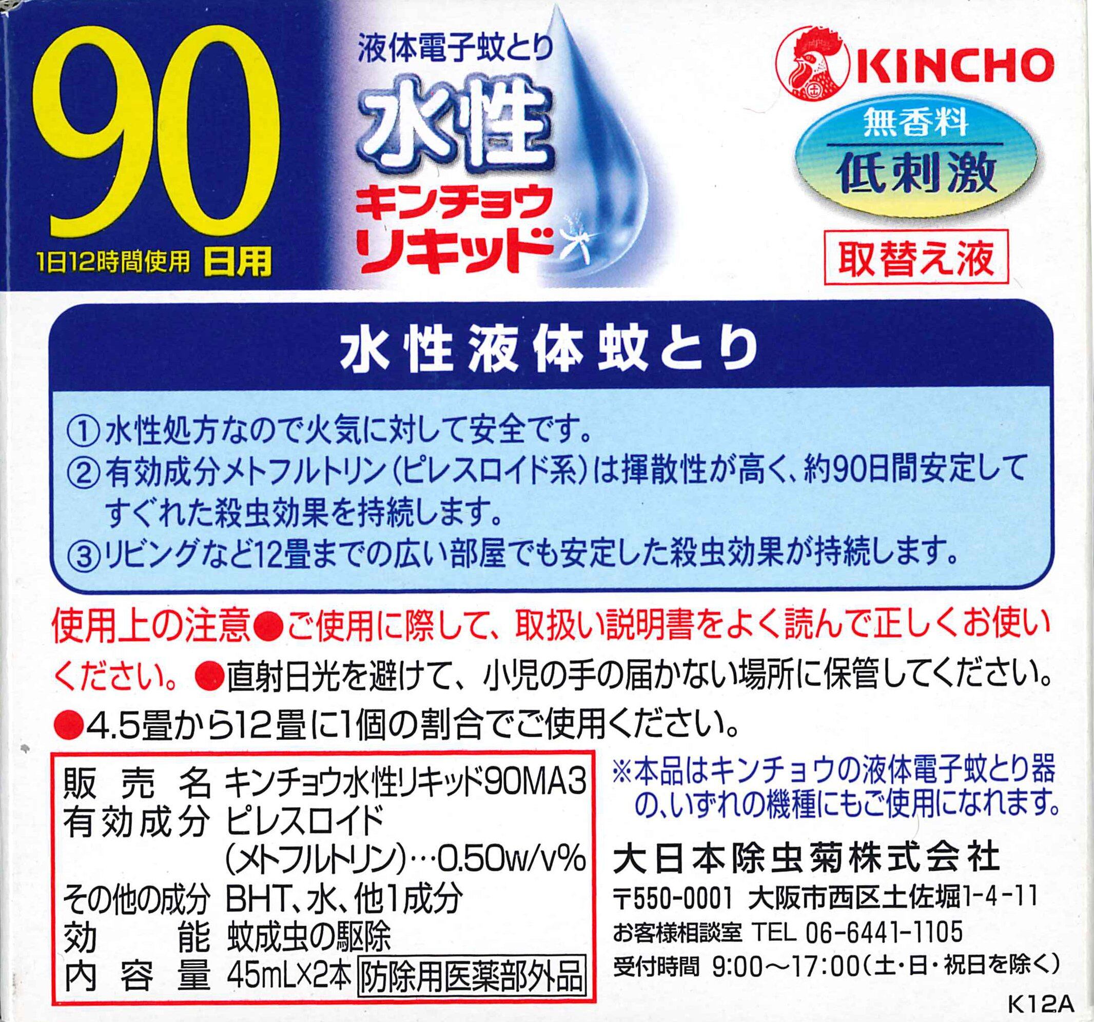 水性キンチョウリキッド コード式 蚊取り器 90日 取替液 2本入 無臭性 低刺激