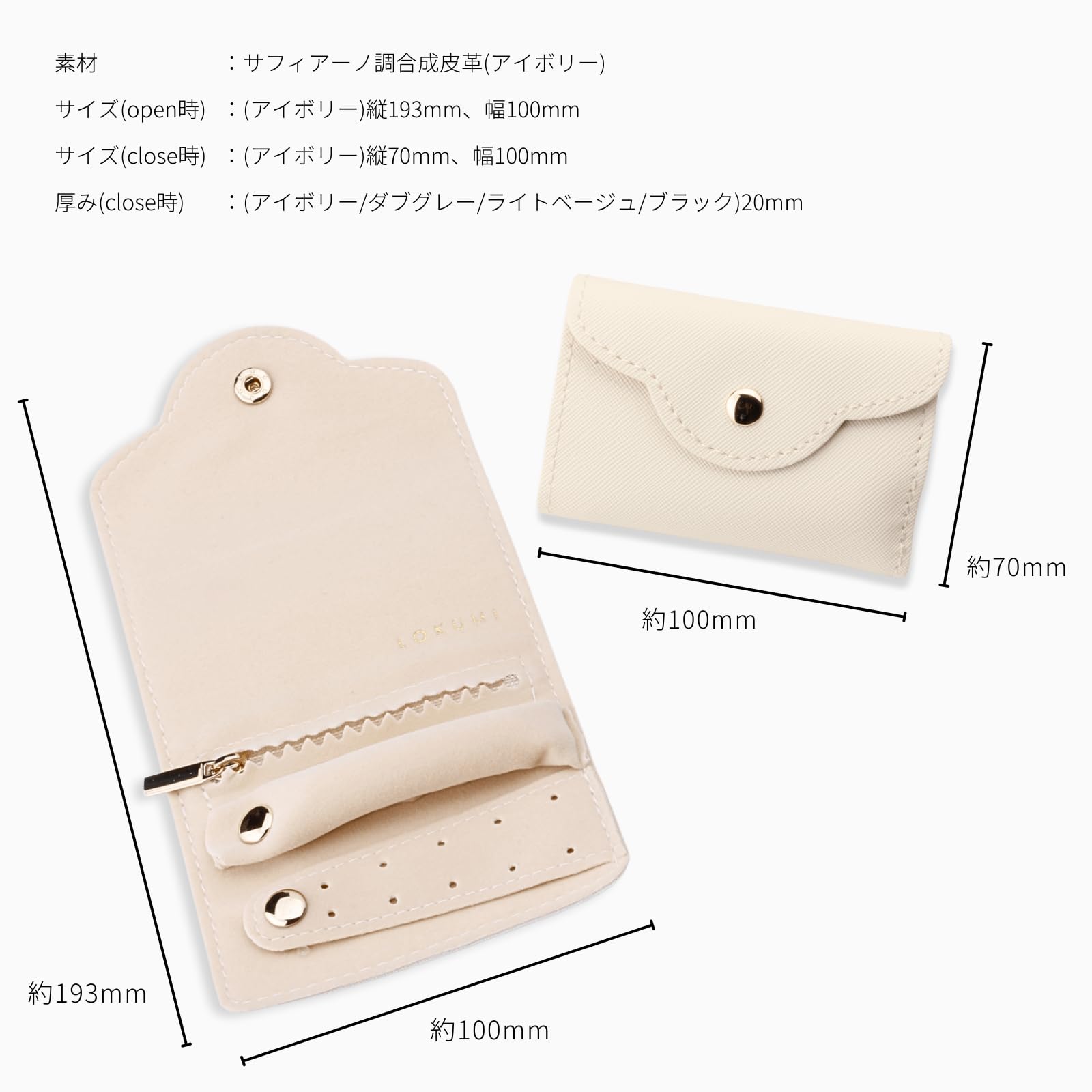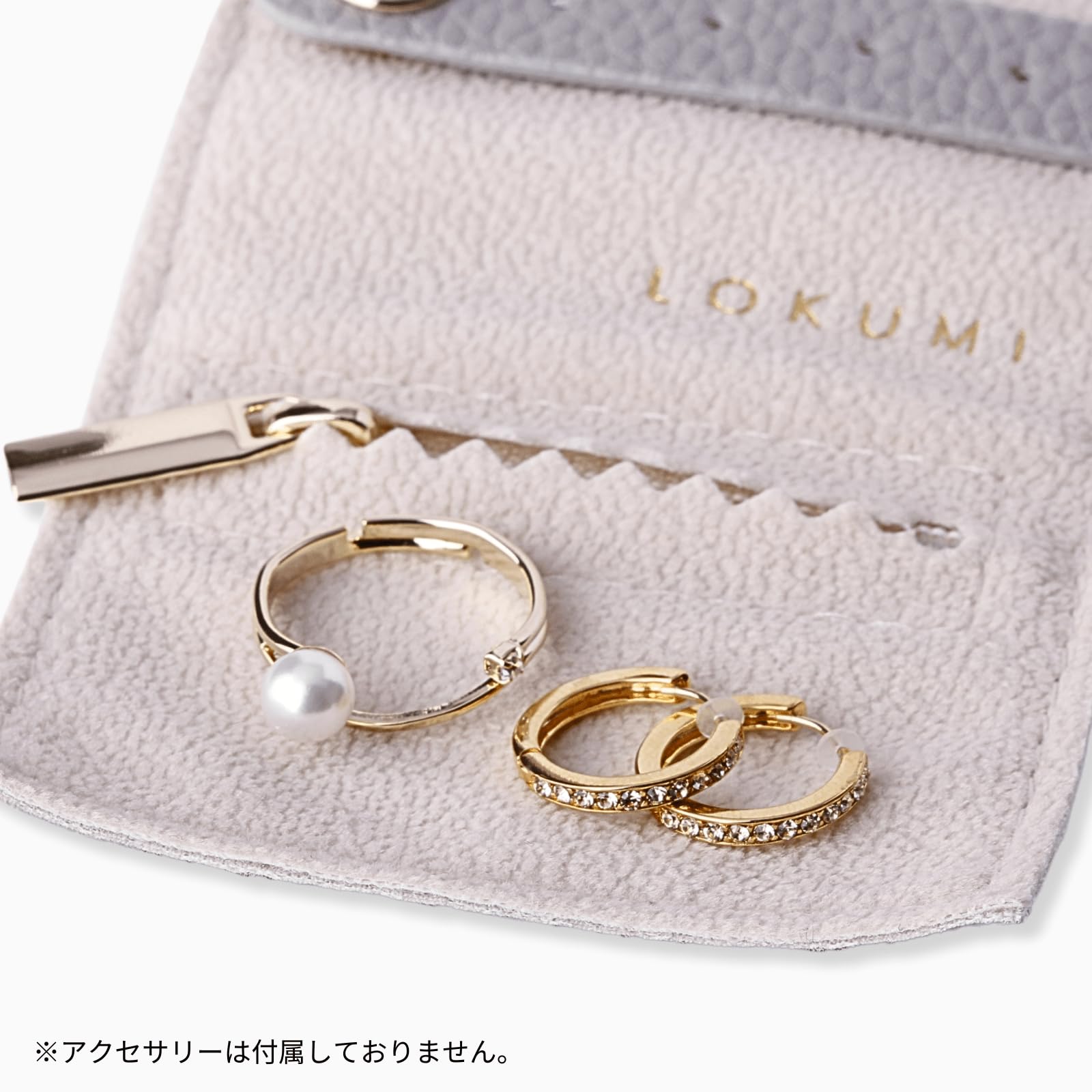 高級感あるシボ調レザー(ダブグレー/ブラック/ホワイトゴールド)、サフィアーノ調レザー(アイボリー)、クロコダイル調レザー(ライトベージュ)にLOKUMIのロゴが刻印されたオリジナルアクセサリーポーチ。軽量かつコンパクトサイズなポーチは旅行や日常での移動にぴったり。 柔らかいスエード生地で作られたピアスホルダー、リングホルダー、ファスナー付ポケットが大事なアクセサリーをしっかりと包み込みます。大切なアクセサリーの保管にもおすすめです。