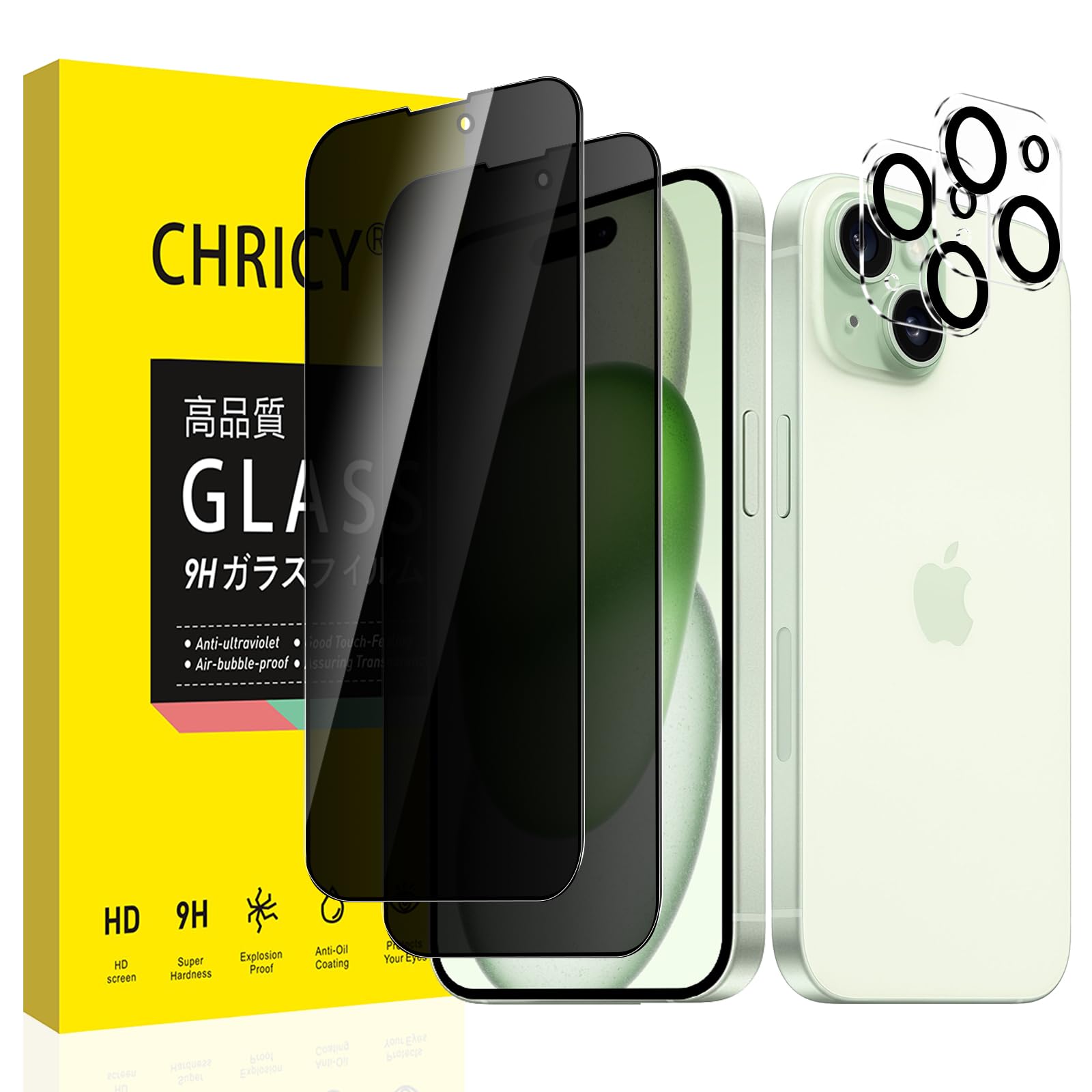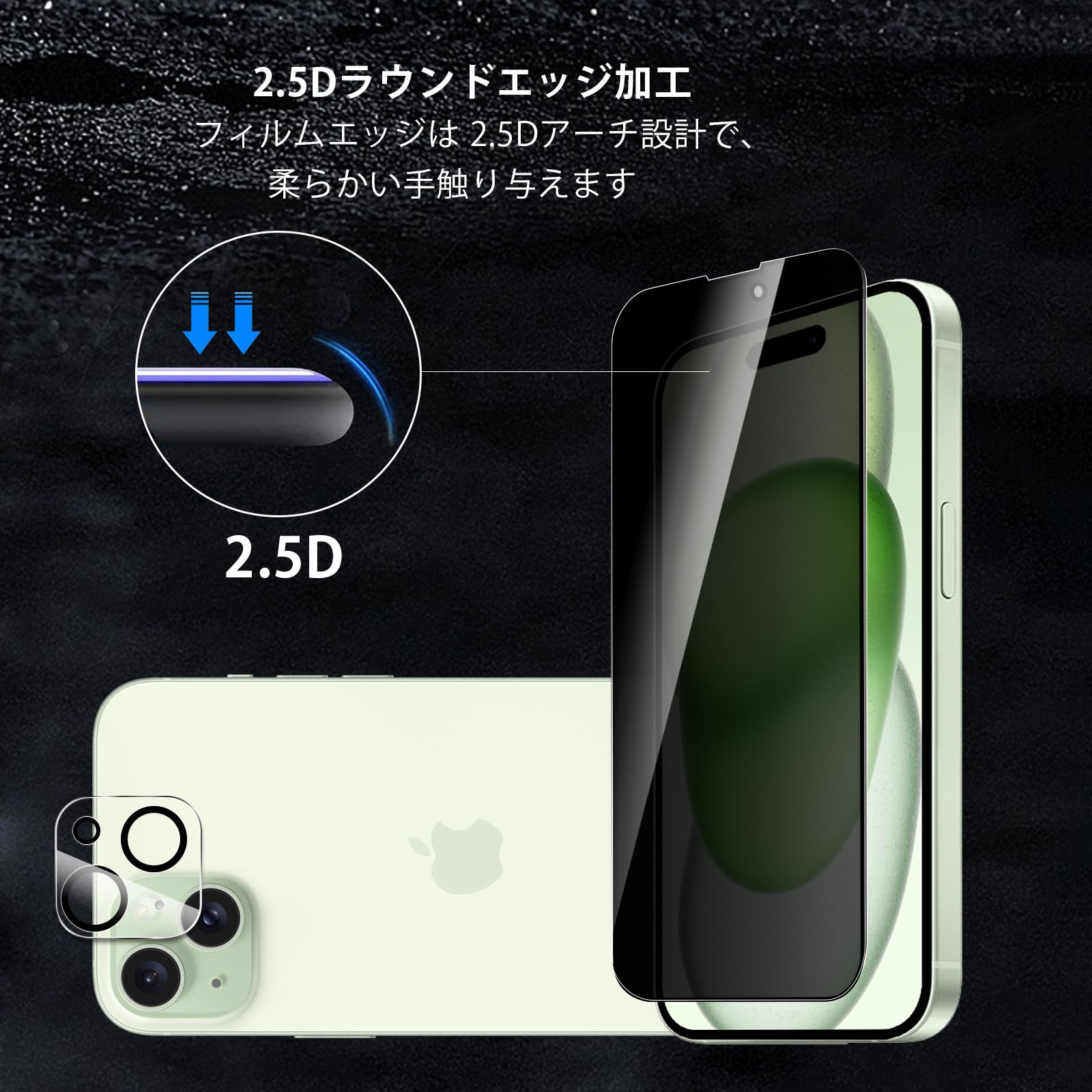【特価セール】【2+2枚セット】覗き見防止 iPhone15 ガラスフィルム (2枚入) + カメラフィルム (2枚入) iPhone 15 保護フィルム 覗き見防止フィルム 強化ガラス 全面保護 気泡ゼロ 指紋防止 飛散防止のぞき見防止