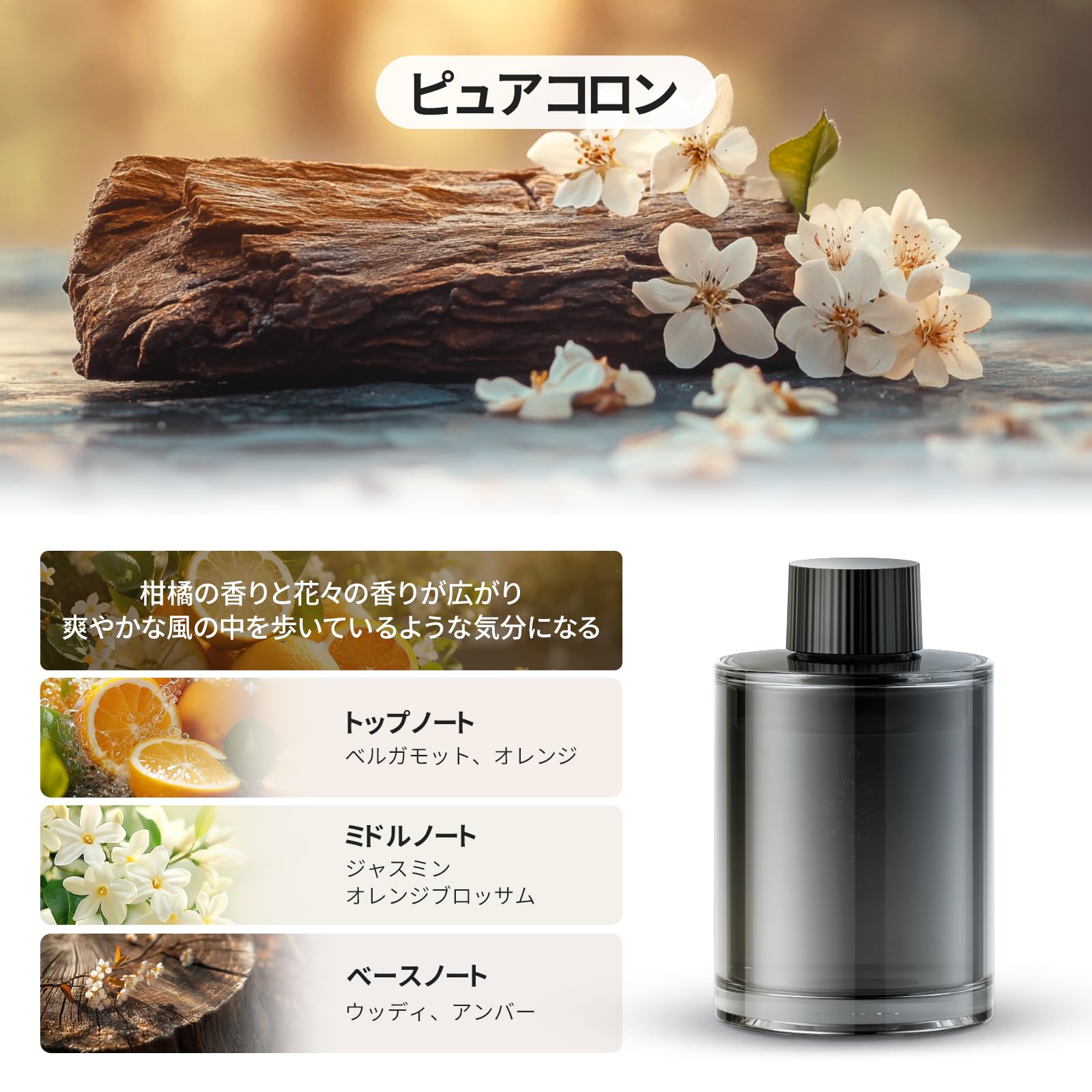 ?【ピュアコロンの香り】柑橘の香りと花々の香りが広がり、爽やかな風の中を歩いているような気分になります。