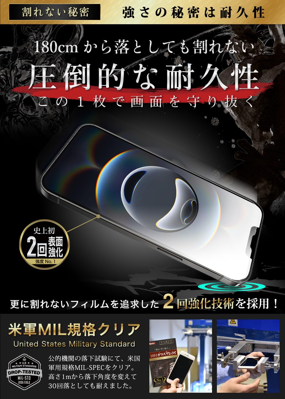 【ナイフでも傷つかない】現在市場では最も硬い10Hの表面硬度。画面割れ”ゼロ”を目指し、カッターでも傷つかず、フィルムを201cmから落としても割れない耐久性を実現