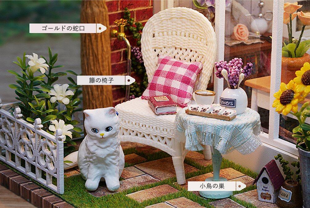 本商品はミニチュアのドールハウスの手作りキットになります。青いリボンをつけた白い看板猫がいる花屋さんのドールハウスです。白い外観が可愛いフラワーショップの中にはお花がたくさん!ライトは実際に点灯します。楽しく作ったあとは、飾ると素敵なインテリアになる一石二鳥なドールハウスです。