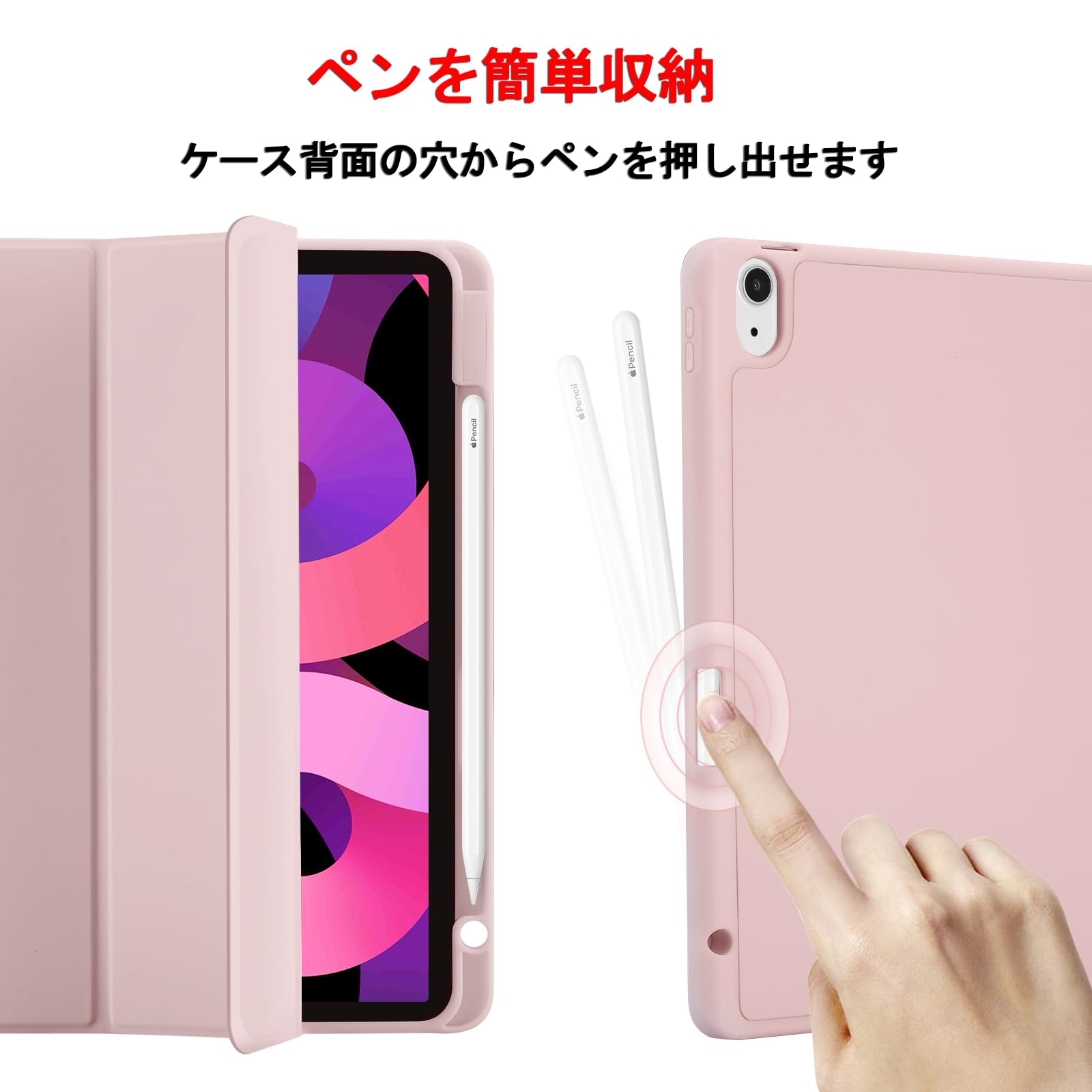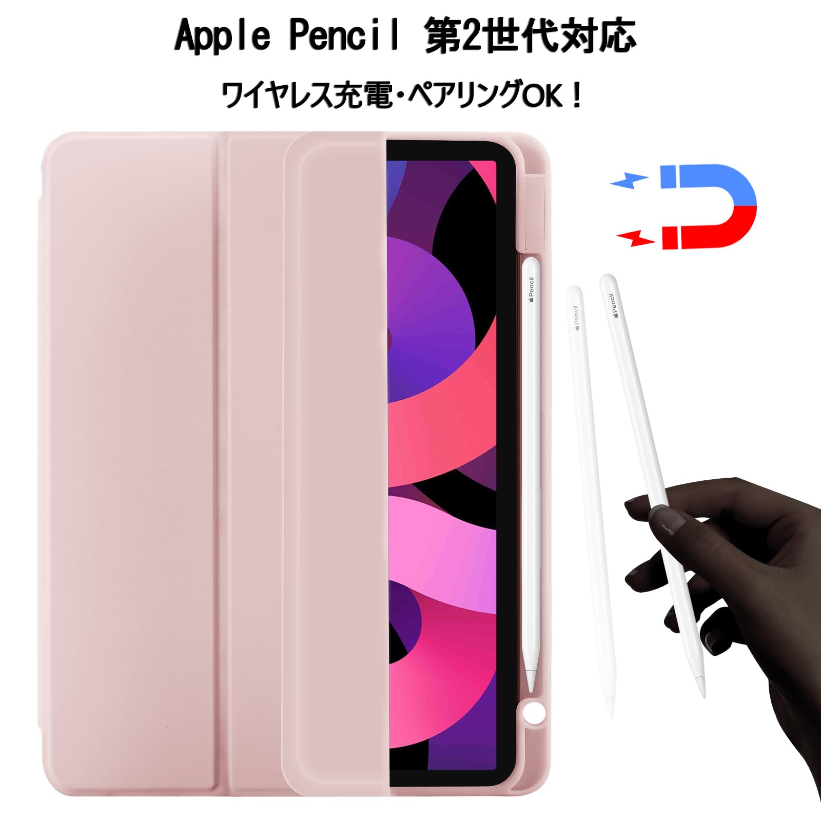 iPad Air 11 インチ ケース M3/M2 2025/2024 iPad Air 第5/4世代 カバー 2022/2020年 10.9インチ Pencil Proペン収納 Apple Pencil2 ワイヤレス充電対応 オートスリープ/ウェイク機能対応 ソフト TPU 薄型 軽量 耐衝撃 三つ折りスタンド (ピンク)