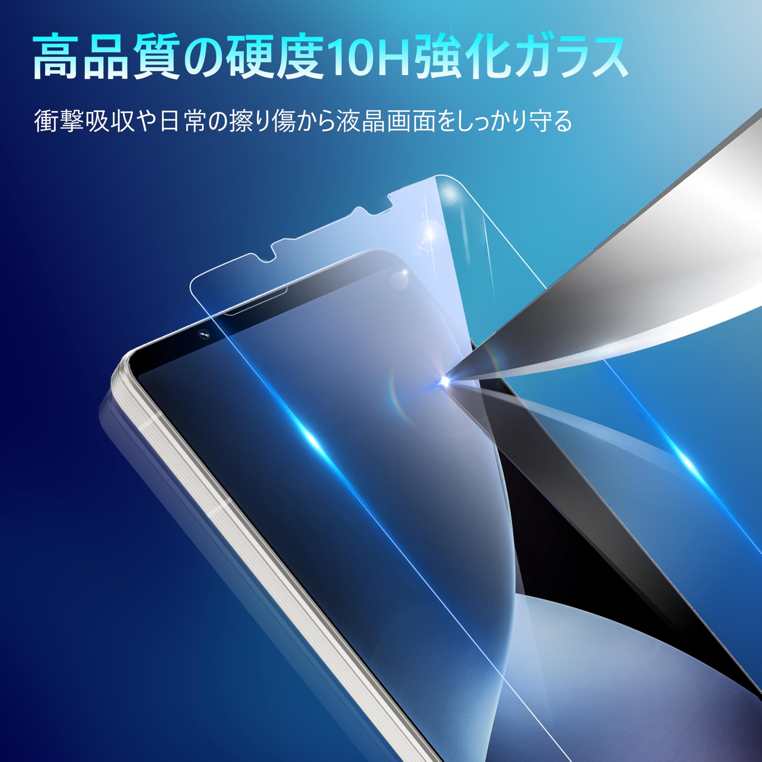 特徴 強化ガラス素材、10H 表面硬度 、擦り傷防止、衝撃吸収、 撮影影響なし 、剥がれにくい 、一体感抜群 、貼り付け簡単