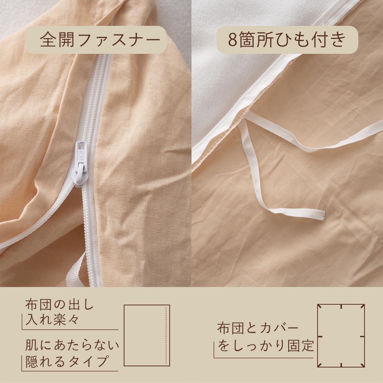 【夜中のズレを防ぐ、8か所固定タイプ】夜中に何度も布団を直す手間を減らしてくれる、8か所の固定具つき。羽毛布団や軽めの布団にもぴったりで、寝相の激しいお子さんと添い寝していてもカバーがずれにくく快適。家族みんなの眠りを支えてくれる、安心感のある掛けカバーです。