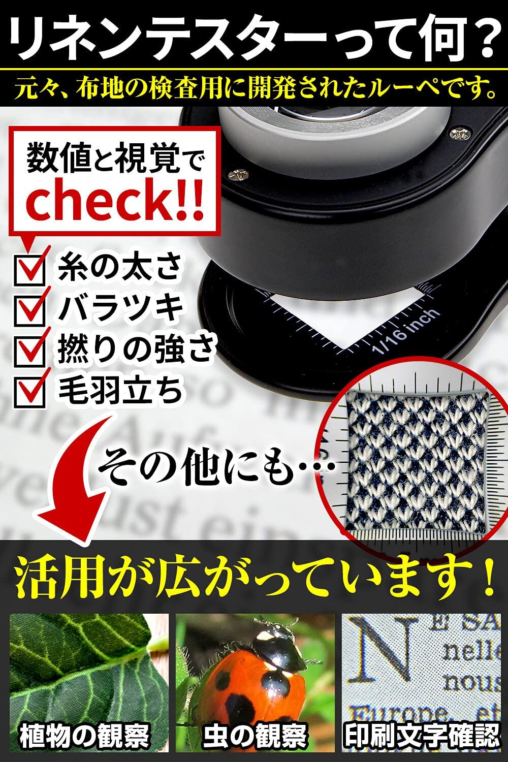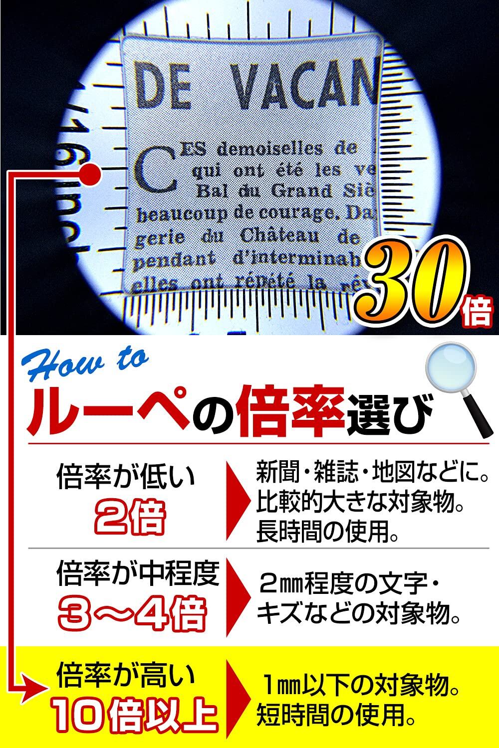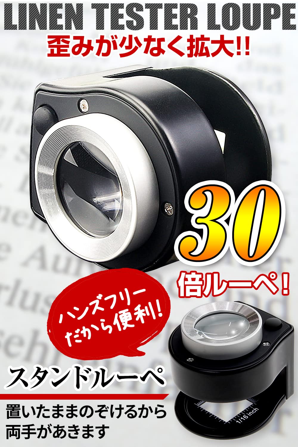 * 【30倍率デュアルレンズルーペ!】歪みが少ない2枚の光学レンズ採用!!元々、布地の検査用に開発されたスタイルのルーペ。今では活用が広がり、電子基板の確認、植物や虫の観察、印刷文字の確認などに活用されています。四角い視野の周りには、スケール付き!!(インチ&mmメモリ採用) 刻印(電気製品・アクセサリー)プラモデル・模型製作・彫刻・検査などにもご利用いただけます。