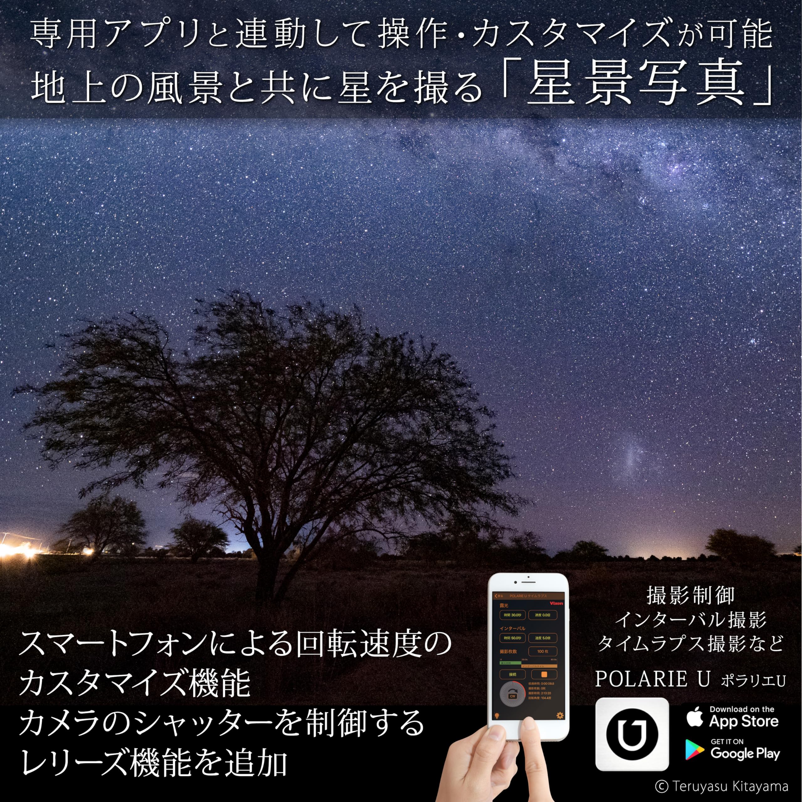 【あなたの写真に“満天の星”を】ポラリエUは気軽に持ち歩けるコンパクトな自動追尾装置。天体の日周運動に合わせてカメラを動かし、従来の自動追尾撮影はもちろん、スマートフォンによる回転速度のカスタマイズ機能、カメラのシャッターを制御するレリーズ機能を追加。インターバル撮影、タイムラプス撮影など撮影制御をスマートフォンで設定できます。
