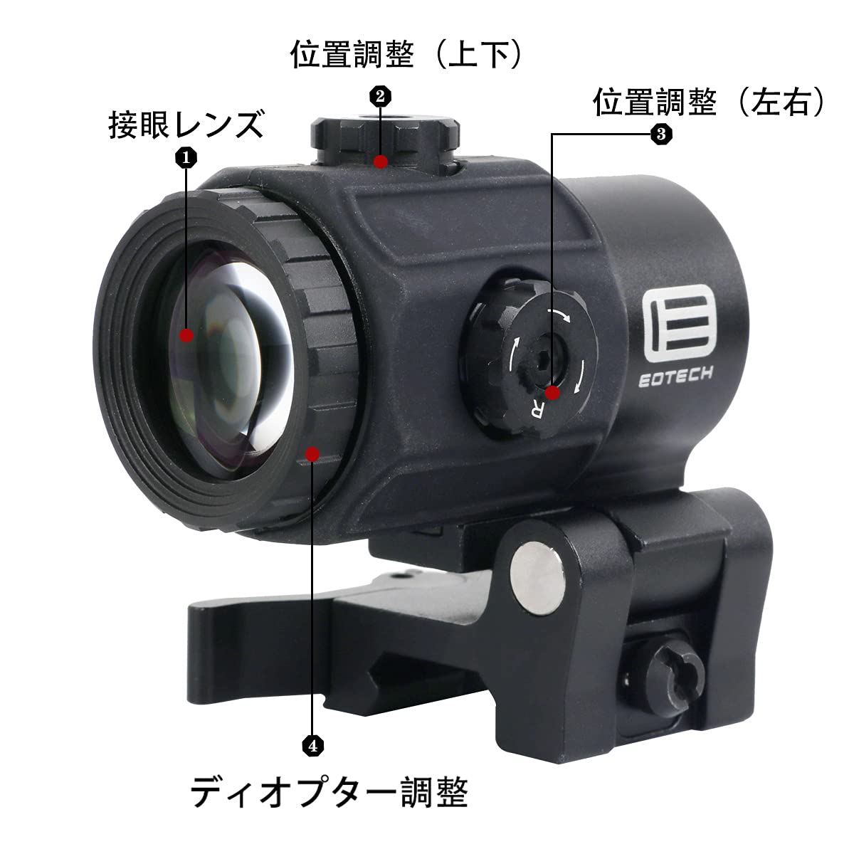 2.この商品は望遠ブースターのため単体では照準、ドットの投影はありません。 各種ドットサイトと合わせて使用をお願いいたします。 照準がドット単体の場合、ドット形状が拡大されることで形がいびつに見える場合があります。 EXPS3、UH1タイプのサークルドット形状はきちんと投影されます。 ◆ドットサイトの高さ、仕様によってダイヤルの調整だけではドットが中央に来ない場合がございますので予めご了承ください。
