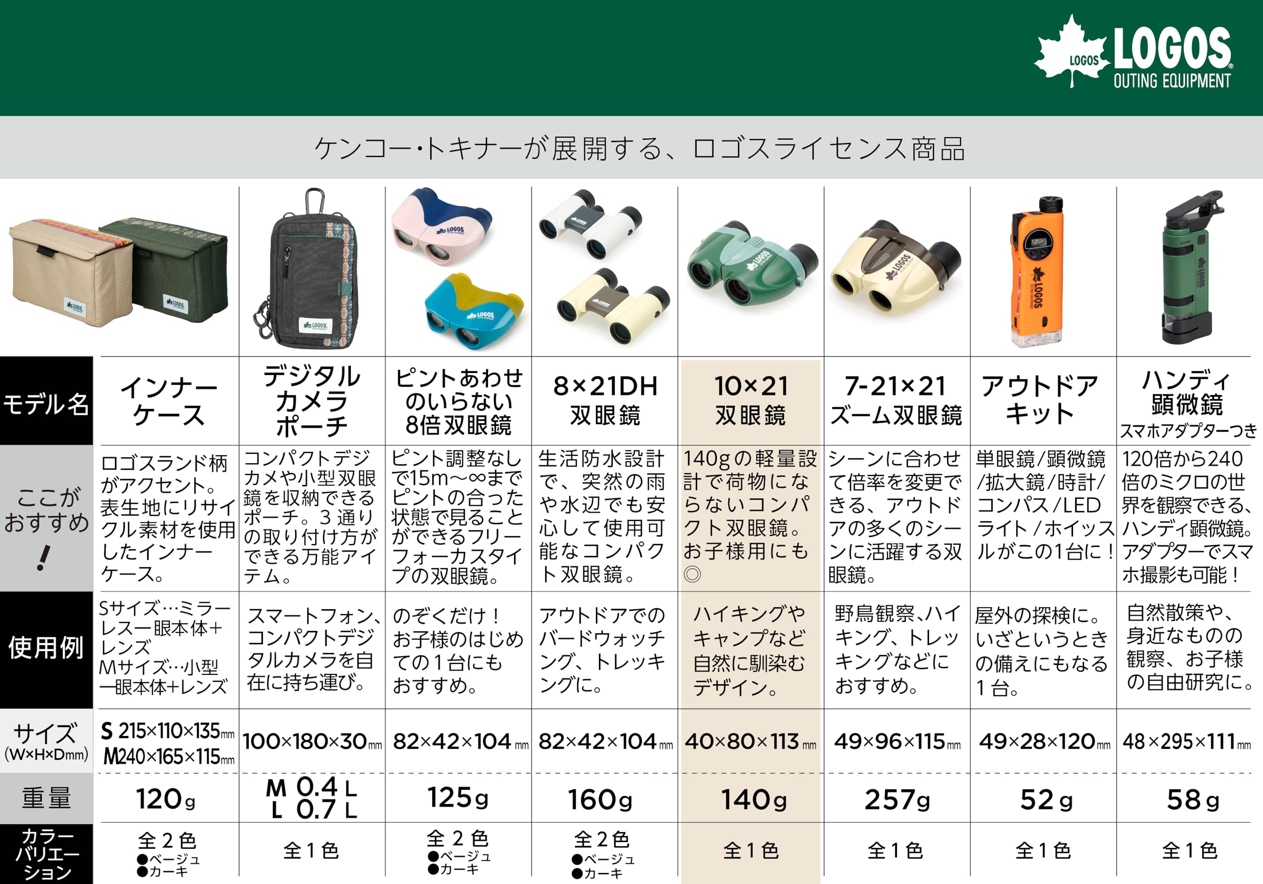 ケンコー 双眼鏡 LOGOS 10×21 倍率10倍 対物レンズ径21mm 140g軽量設計 ネックストラップ付属 グリーン LK-CE1021