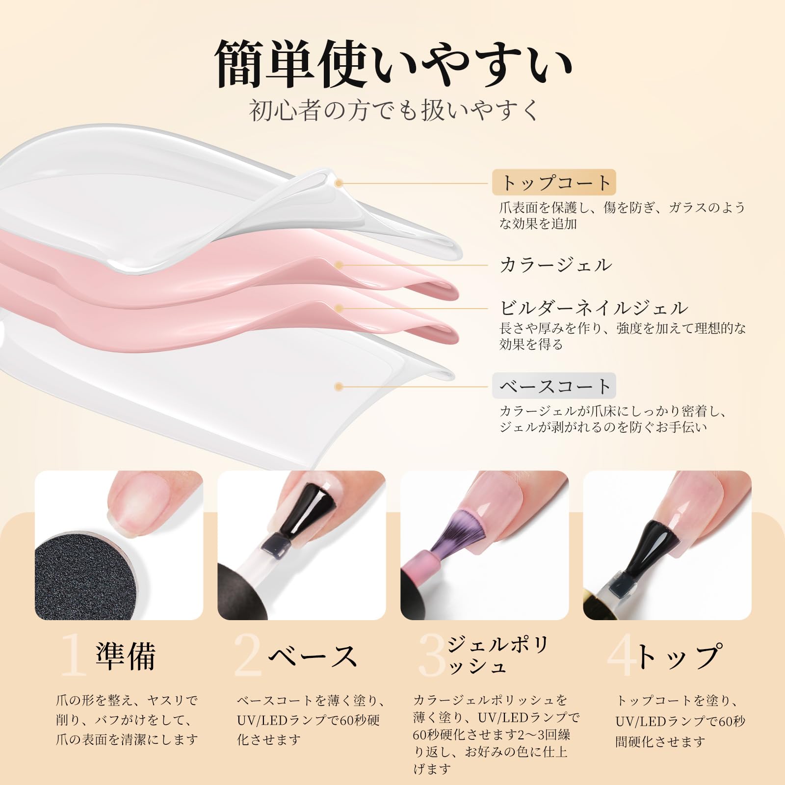 28日間長持ち: ジェルネイルポリッシュベースとトップコートは、耐摩耗性があるため、適切に塗布すればジェルを28日間以上持続させることができます。柔軟性のあるUVジェルトップコートは、爪に光沢のある輝きを与え、傷や欠け、汚れを防ぎます。