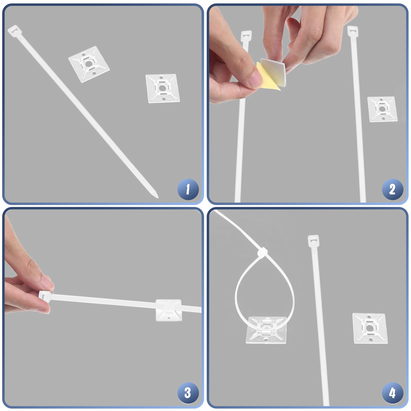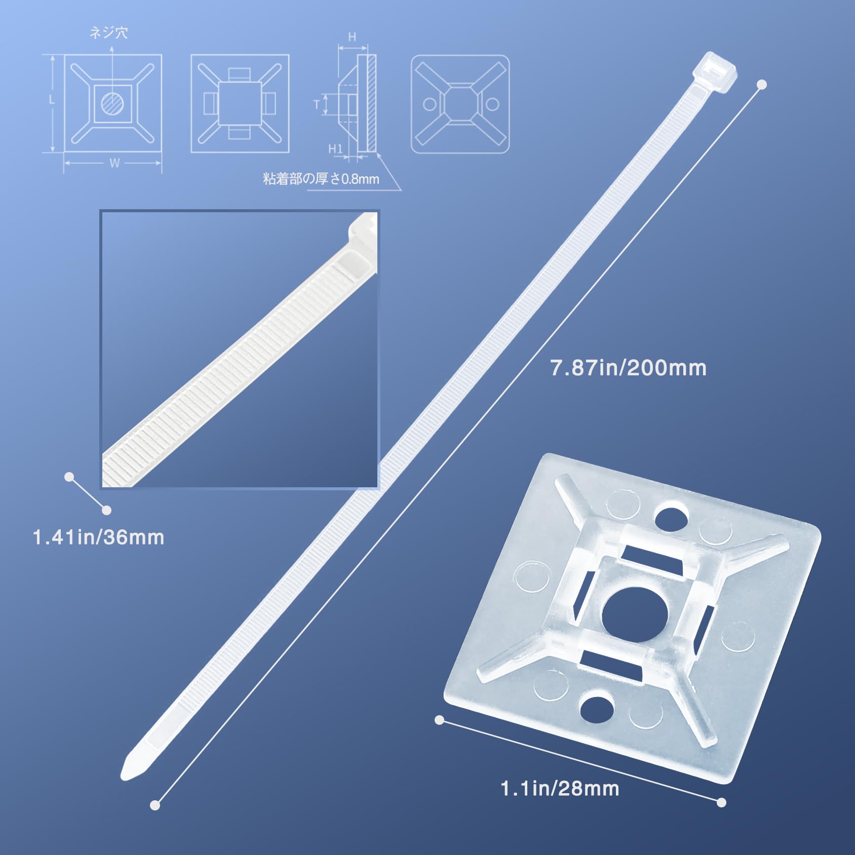 【セット】パッケージ内容:透明:2.8 cm x 2.8 cmのマウントベース*50個、ホワイト:3.6 x 200 mmナイロン製パンドウイット*50本。結束バンドとマウントベースを組み合わせて使用すれば、簡単にコードをきれいに整理できます。