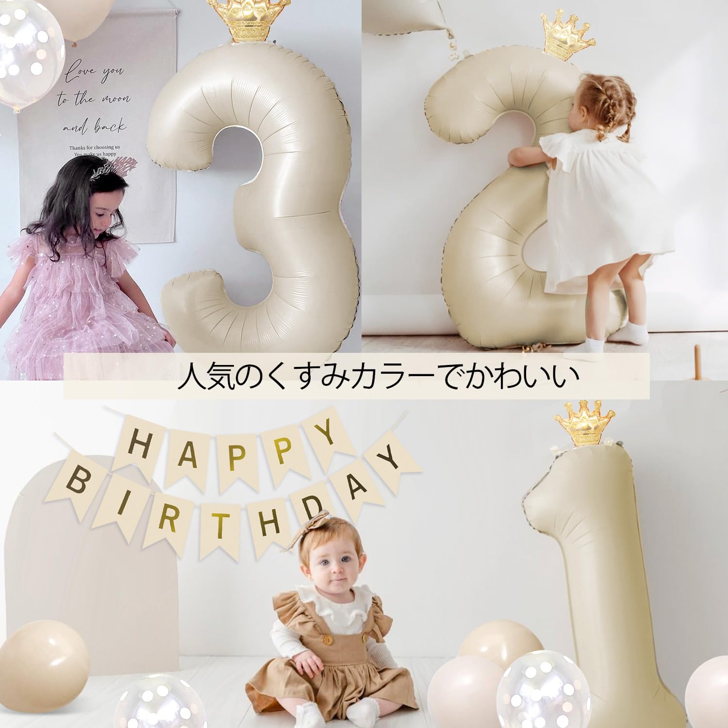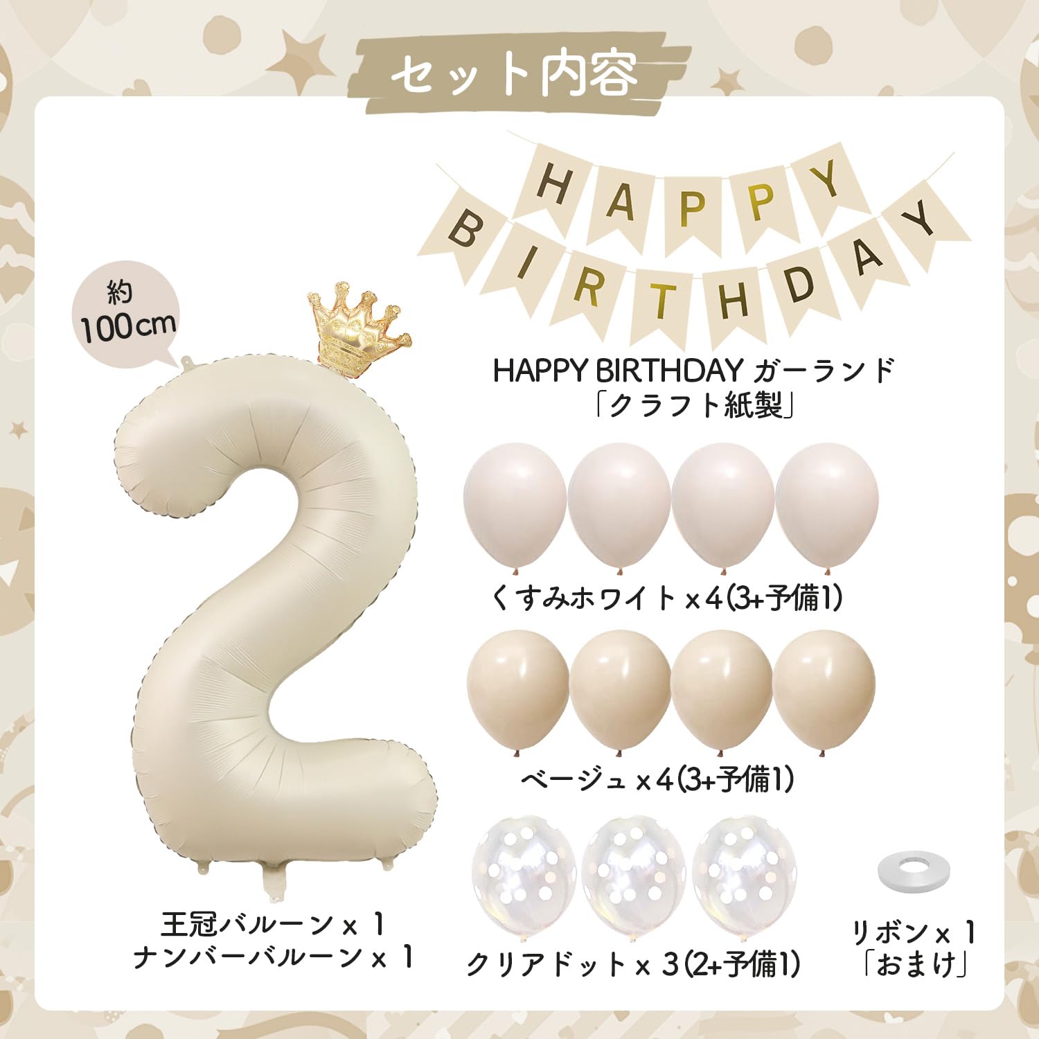 【くすみカラー風船セット】①ナンバーバルーンx1(高さ90cm) ②ミニ王冠バルーンx1③HAPPY BIRTHDAY ガーランドx1「クラフト紙製」 ④グレージュ風船x4(3+予備1)⑤ベージュ風船x4(3+予備1)⑥クリアドット風船x3(2+予備1)⑦リボンx1「おまけ」⑧ドットシール「おまけ」※ペタンコの状態でお届けです。