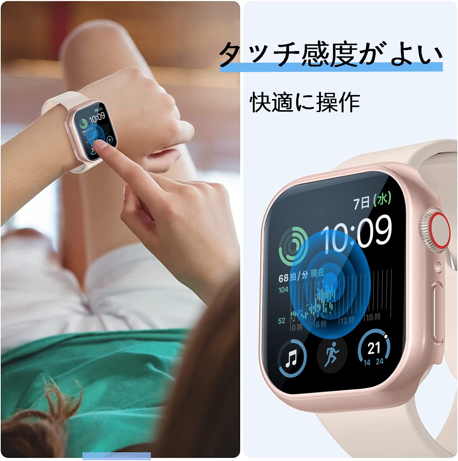 【高タッチ感度】Apple watch ケース画面部には超薄9H強化保護ガラスフィルムを採用し、高透過率、従来のタッチセンサーの感度を保持しています。アップルウォッチ本体にフィットし、快適なつけ心地を再現します。Apple watch 本来の美しさを保ちます。