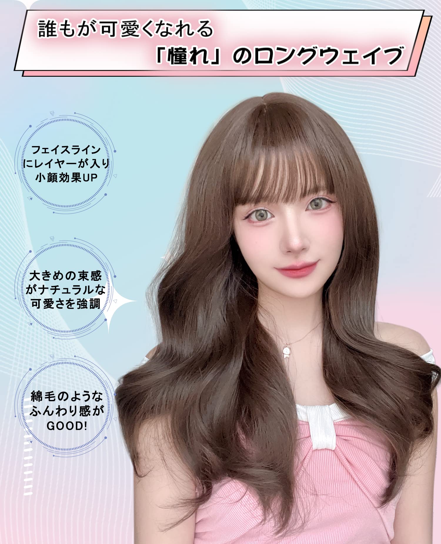 誰も可愛くなれる「ふんわりウェーブウィッグ」です。すこし長めのレイヤーは入っているので、フェイスラインをカバーして小顔効果UP!洗練されたゆるめのウェーブが、さらに愛らしいイメージをアップ。地毛だとセットが大変なロングウェーブもウィッグなら簡単に再現可能。