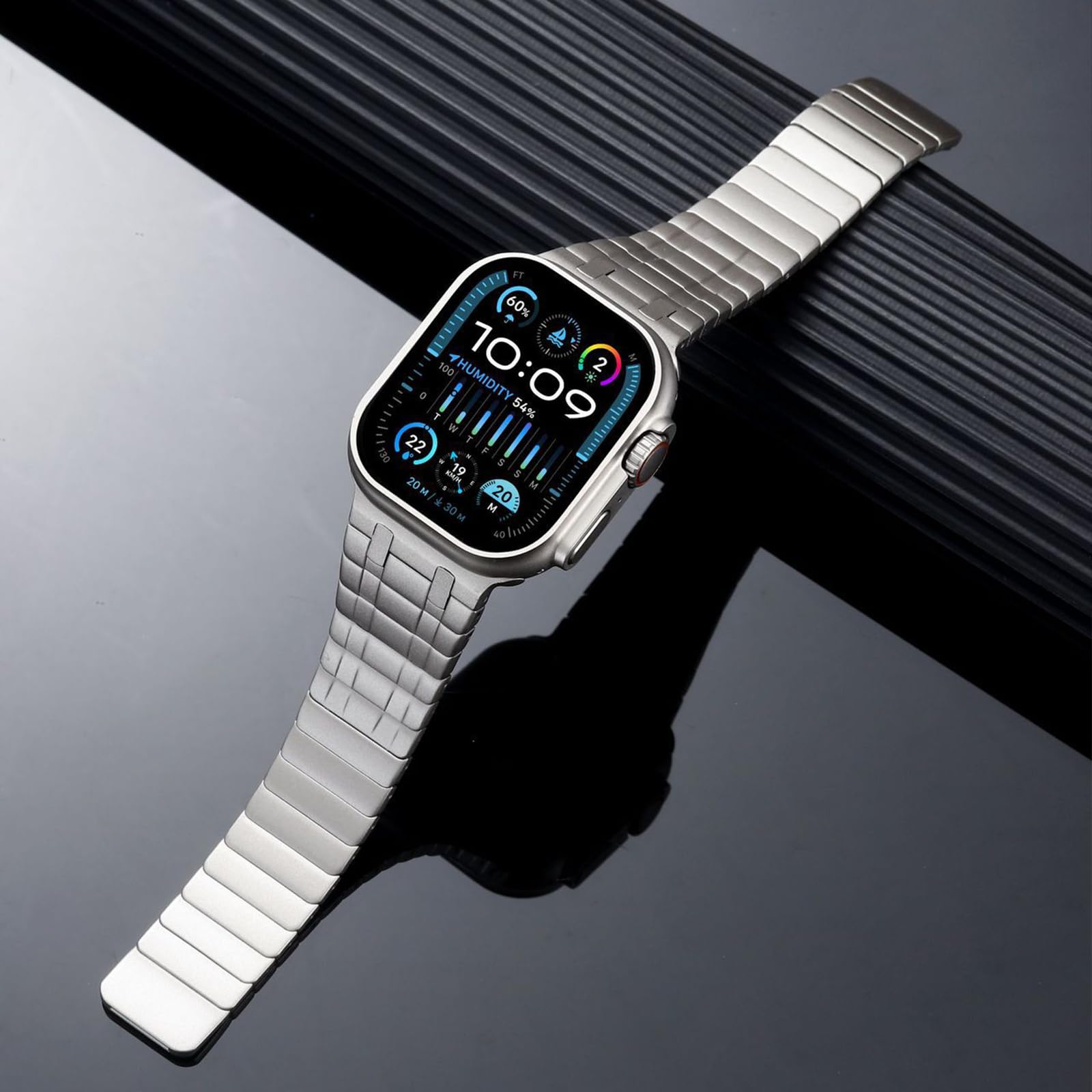 ?素材は高品質なステンレススチールを採用しており、優れた耐久性と高級感を兼ね備えています。ステンレススチールは傷がつきにくく、サビや腐食に強いため、長期間使用しても美しい状態を保ちます。また、適度な重量感があり、手首にしっかりとフィットすることで快適なAppleWatch(アップルウォッチ)の装着感を提供。カジュアルからフォーマルまで、あらゆるシーンで洗練されたスタイルを演出するベルトです。