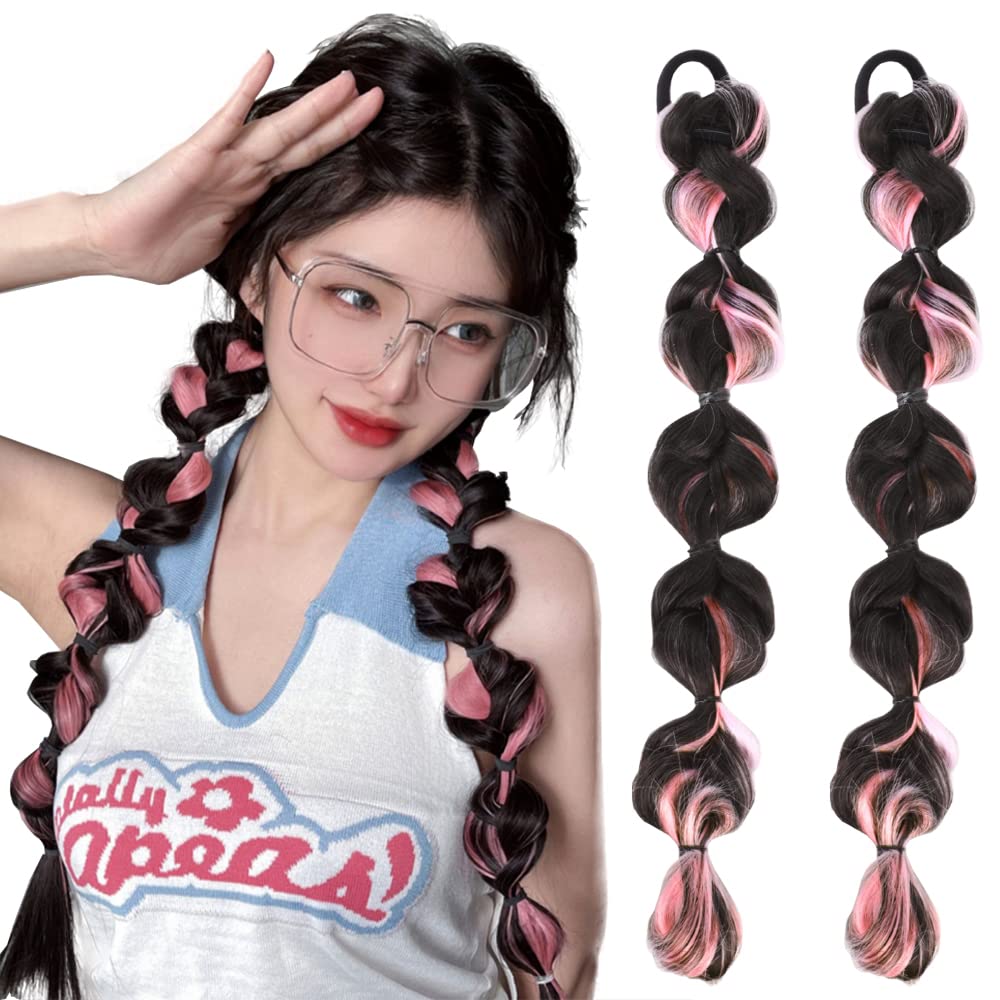 ヘアエクステ 三つ編み ウィッグ 2個セット 取り付け簡単 カラーエクステ 編み込み 髪の毛 ポニーテール 延長 ツインテール デュアルテール 自然 おしゃれ 着脱簡単 少女 レディース 発表会 イベント フェス パーティー 誕生日会 子供 大人 (櫻のピンク)