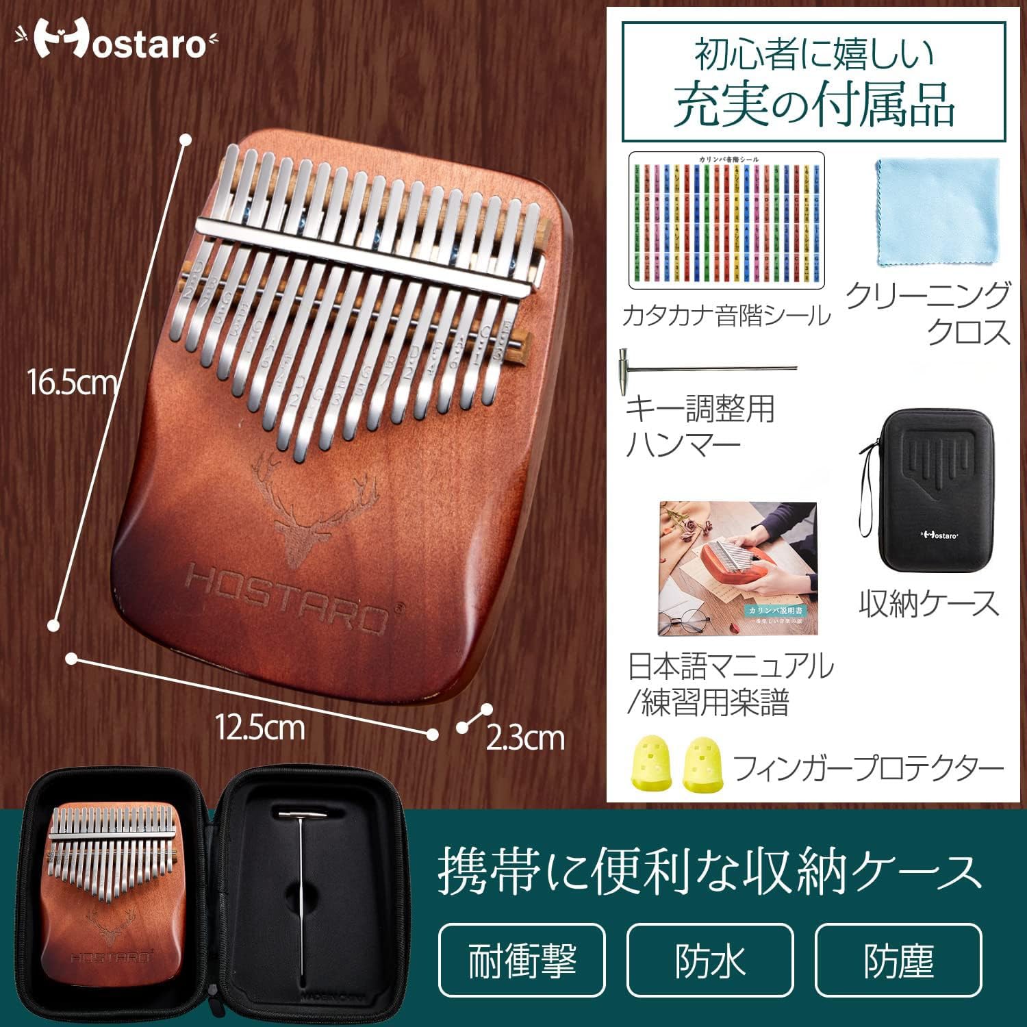 【商品仕様】○サイズ:16.5㎝×12.5㎝×2.3㎝ ○素材:メープル材、天然鉱石(スチールバー部分) ○重量:カリンバ本体 ○セット内容:カリンバ本体/専用収納ケース/クリーニングクロス/チューニングハンマー/フィンガープロテクター×2/日本語マニュアル/カタカナ音階シール ○ブランド:Hostaro