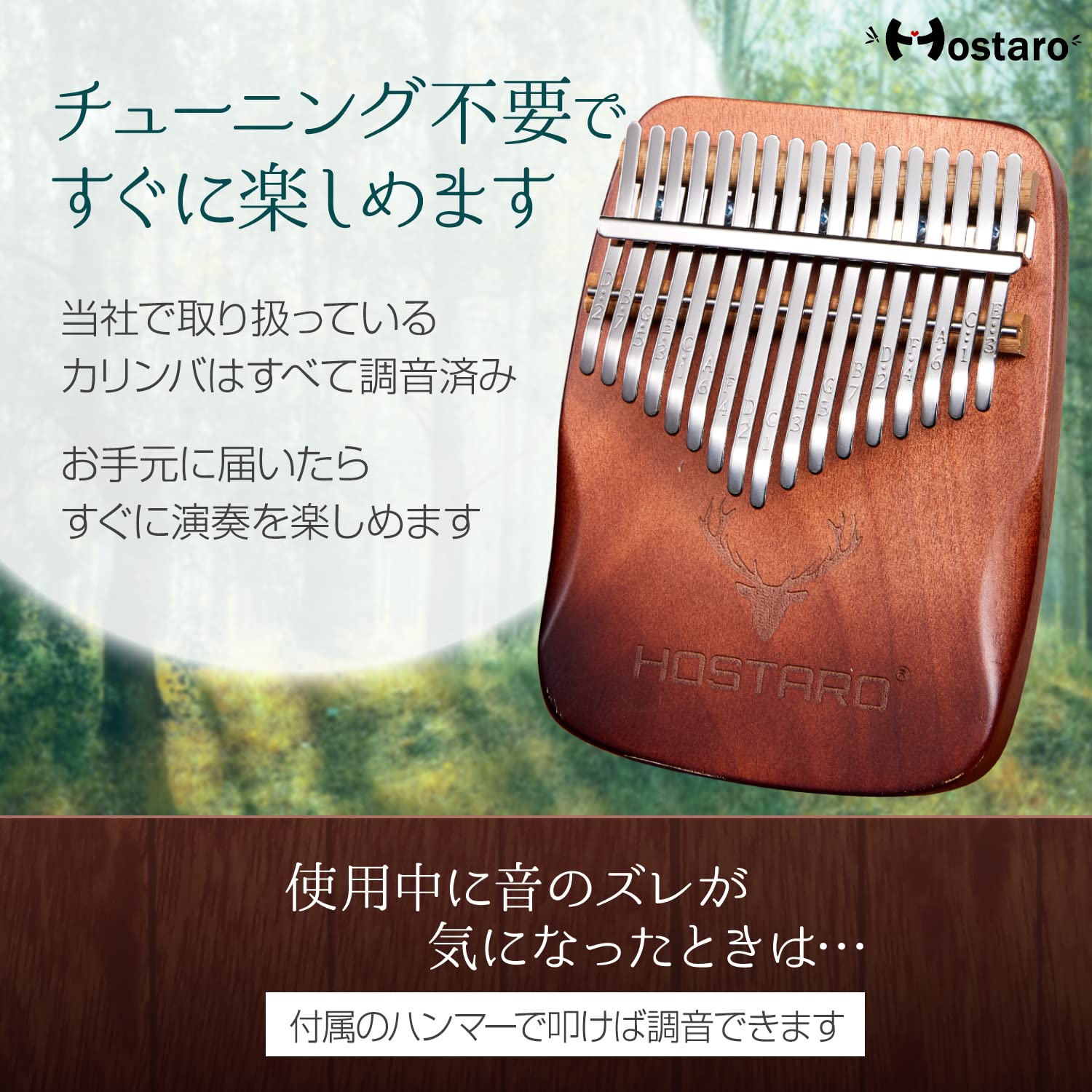 【チューニング不要】こちらで取り扱っているカリンバはすべて調音済みのため、商品がお手元に届いたら手間をかけることなくすぐに演奏が楽しめます。使用中に音のずれが気になったときは、付属のハンマーで叩いて調音してください。