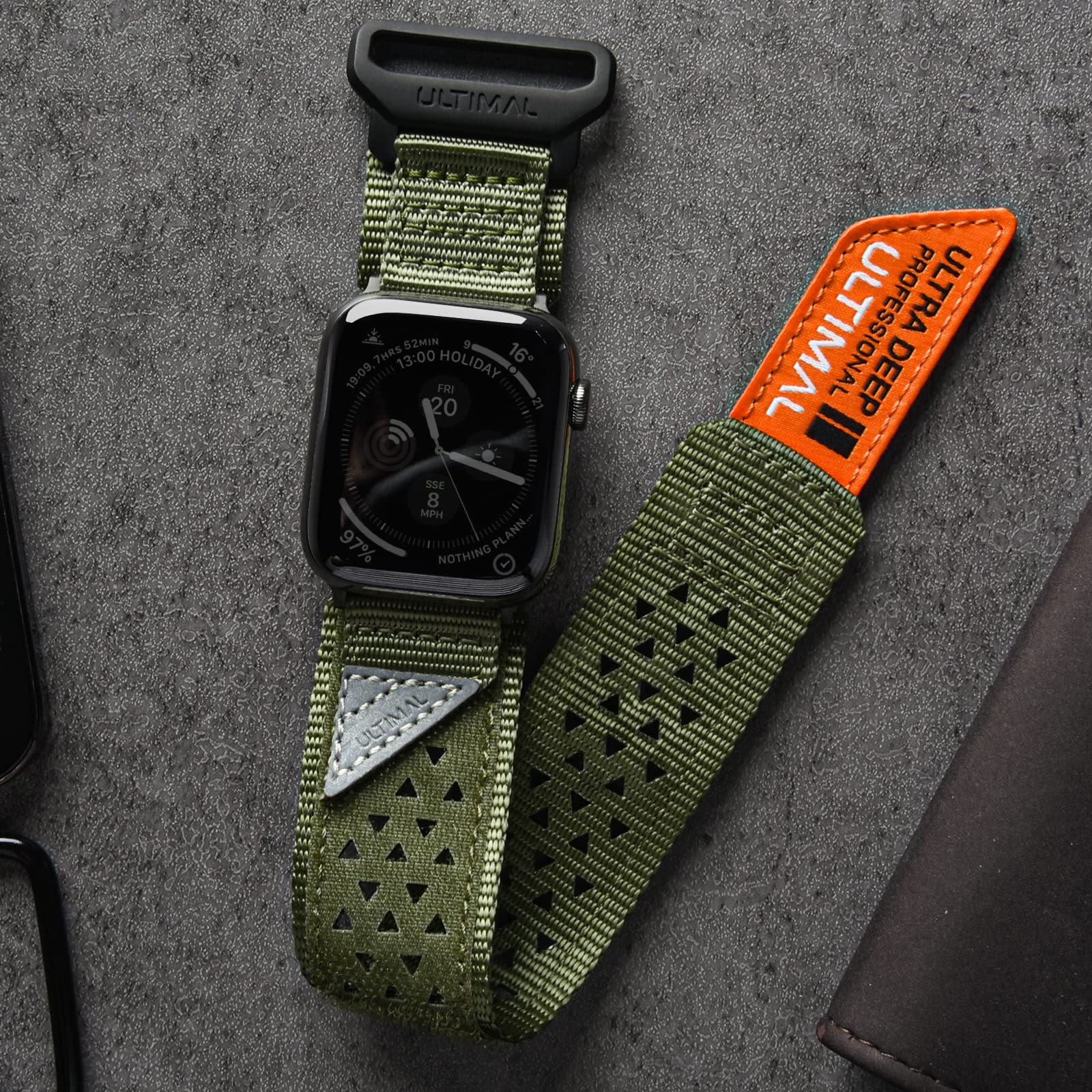 ULTIMAL コンパチブル Apple Watch バンド アップルウォッチバンド 44/45/46mm ナイロン 中空 通気性 交換ストラップ スポーツバンド マジックテープ メンズ レディース iWatch 9/8/7/6/5/4/3/2/1/SE/SE2対応 (透かし彫り-44/45/46mm-L(手首周り17-22.6cm対応) アーミーグリーン)