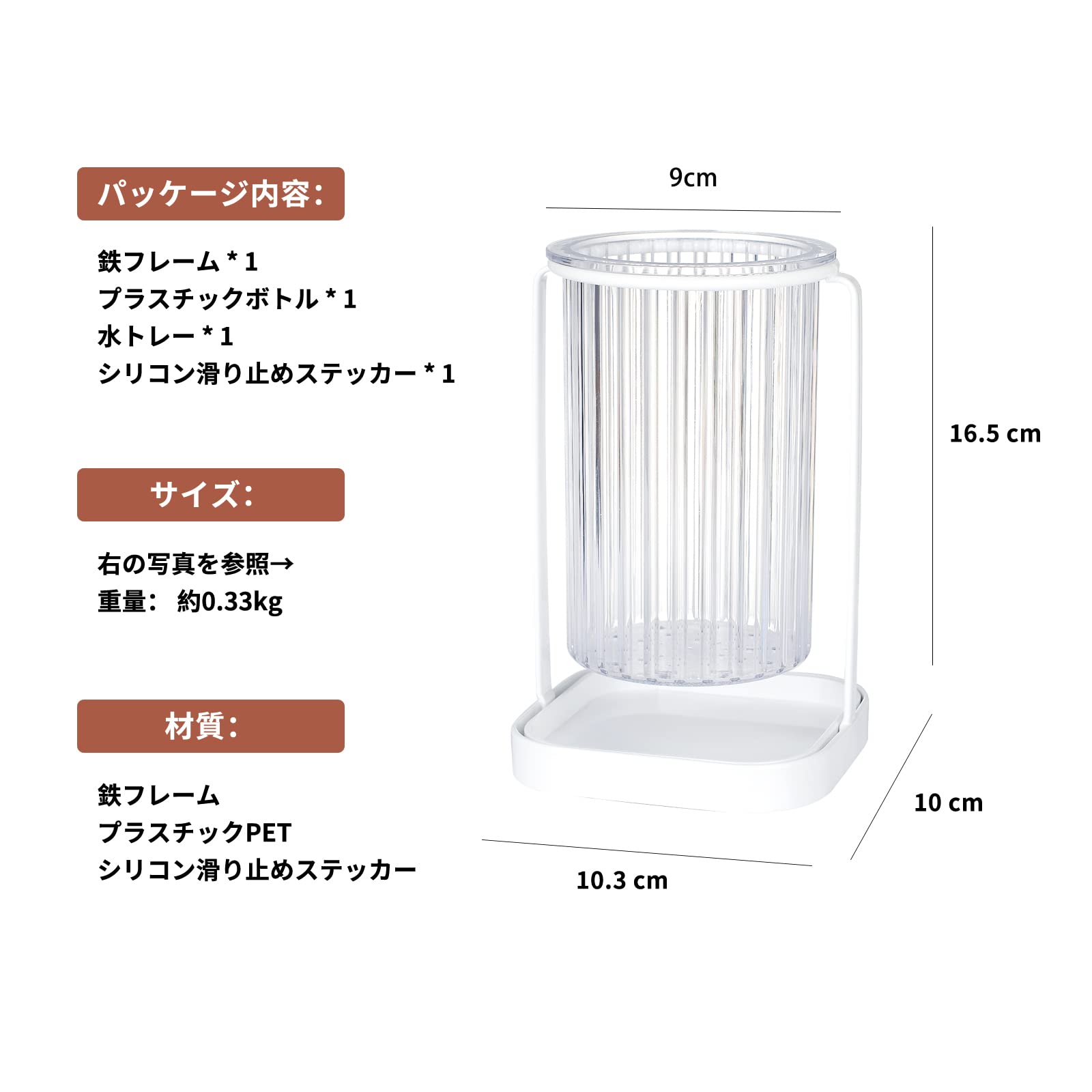 【サイズ】:幅10.3*高さ16.5cm ボトル直径:9cm 内径:7.4cm 重量:約0.33kg 材質:鉄フレーム、収納筒とトレ:プラスチックPET シリコン滑り止めステッカー。