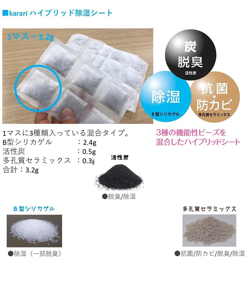 ●シートの中にはB型シリカゲル、活性炭、多孔質セラミックの3種類のビーズが入っており湿度だけでなくアンモニア、ホルムアルデヒド以外にも、幅広いニオイも級着します。