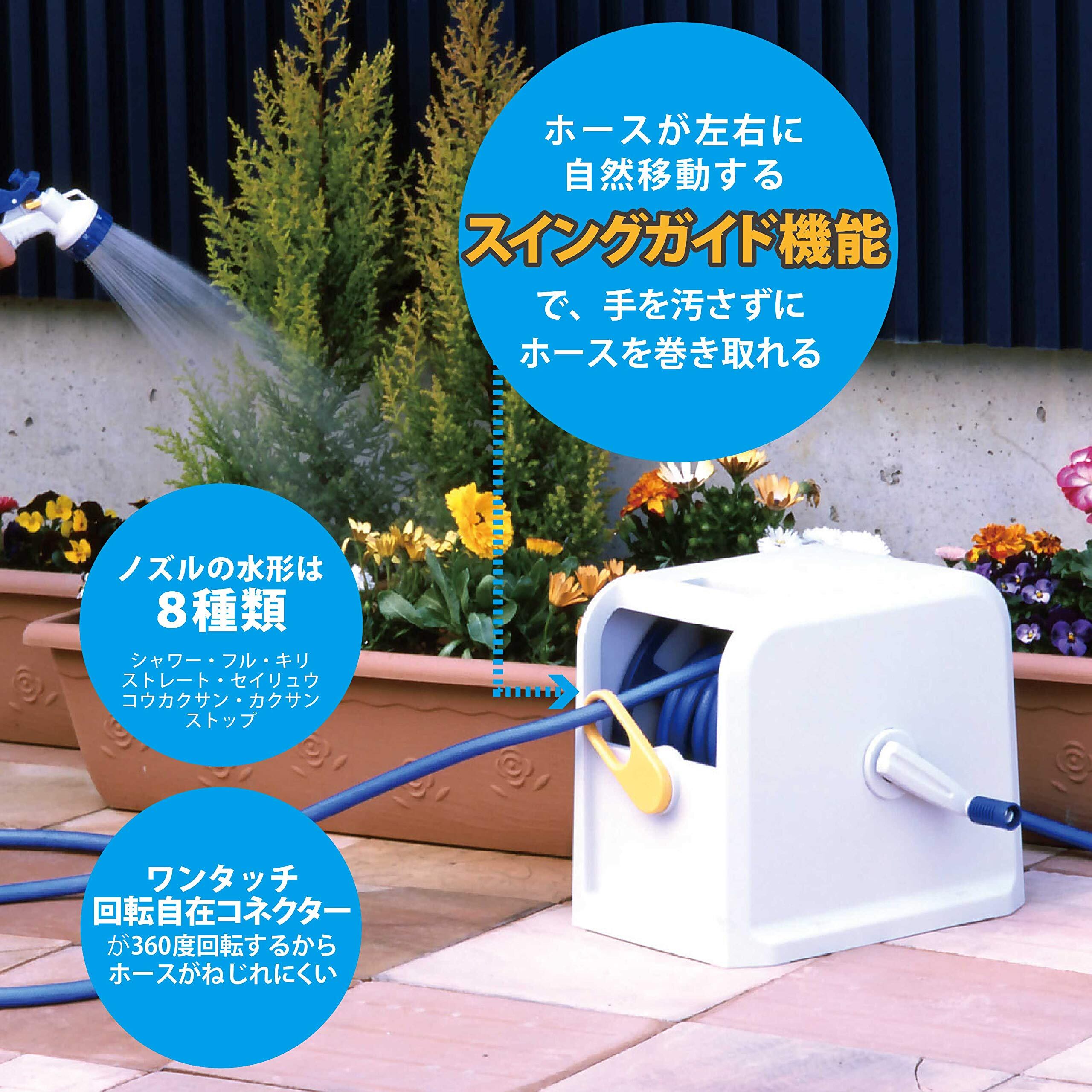 ??【スイングガイド機能付き】ホースを巻き取る際、綺麗に均等に巻き取るためには土などが付着したホースを手で押さえながら巻き取る必要がありますよね??こちらの商品は、スイングガイドにより、ホースに触れなくても自然に左右に巻き取られ、より快適にご使用いただけます。