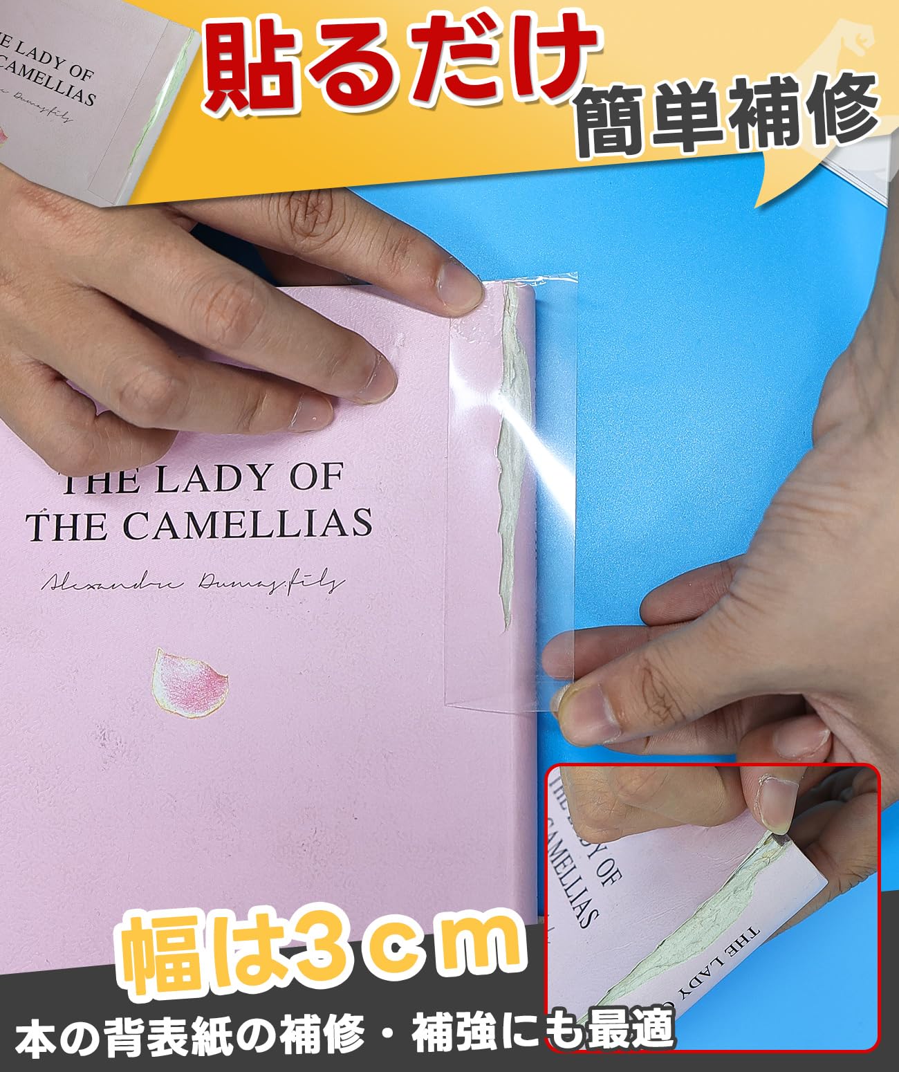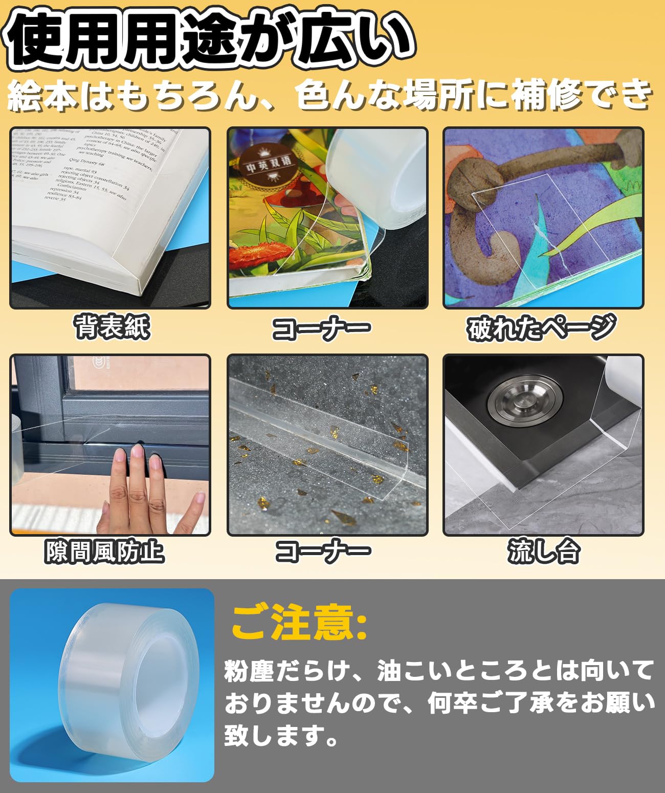 【 完全透明/違和感なく】防水補修テープは完全透明なデザイン、サイズは自由にカットできます、貼りやすくてあっという間に綺麗になります。特別な工具を使う必要がなく、適切な長さをカットしてから、貼りたいところに貼ってしっかりと押すとオーケーです。違和感などもありません、目立ちにくい、絵本本来の姿をキープします。