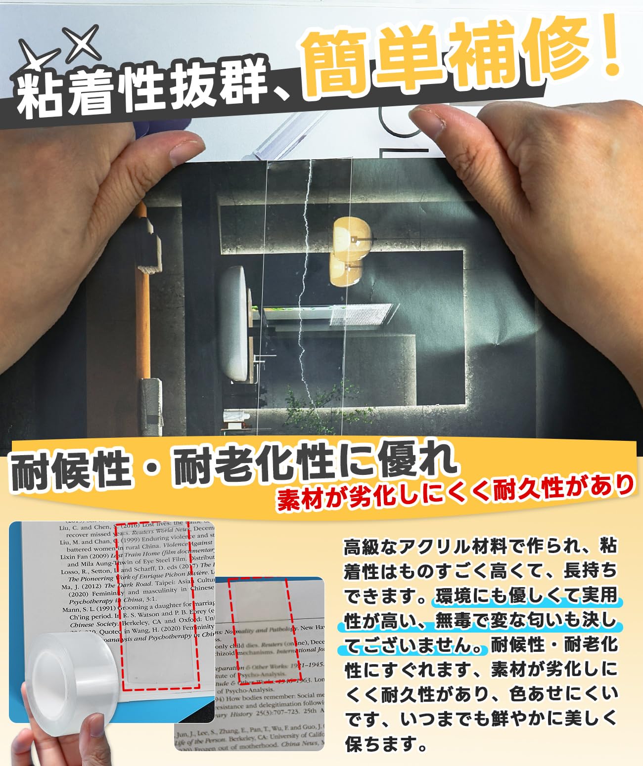 【粘着性抜群/耐候性・耐老化性】普通の補修テープと違い、本テープは高級なアクリル材料で作られ、粘着性はものすごく高くて、長持ちできます。環境にも優しくて実用性が高い、無毒で変な匂いも決してございません。耐候性・耐老化性にすぐれます、素材が劣化しにくく耐久性があり、色あせにくいです。