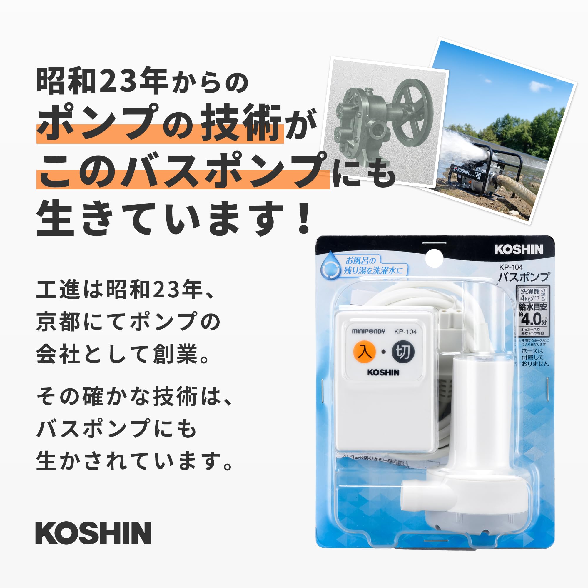 工進(KOSHIN) 家庭用バスポンプ AC-100V KP-104 風呂 残り湯 洗濯機 最大吐出量 14L/分 (3mホース時) 水道 ホース 内径 15mm 使用可能