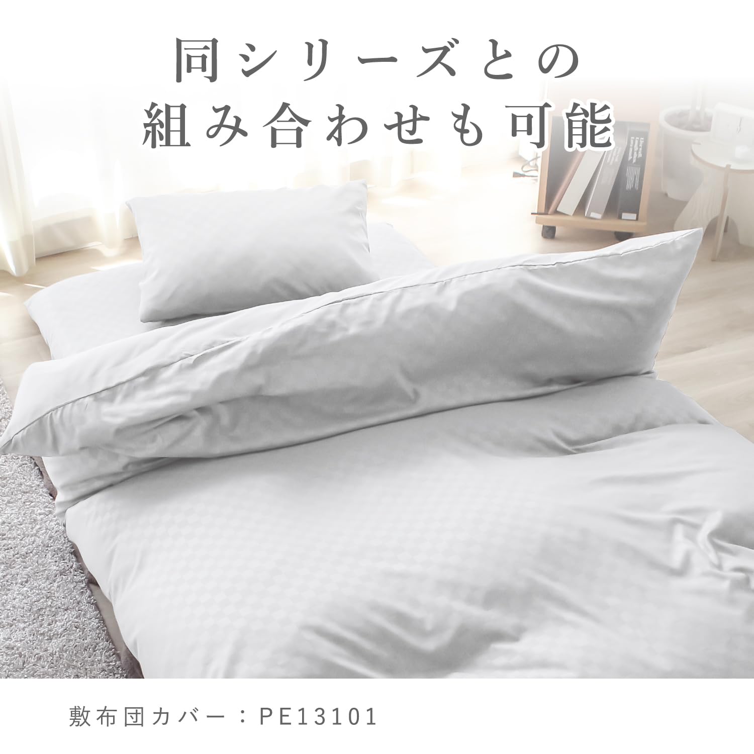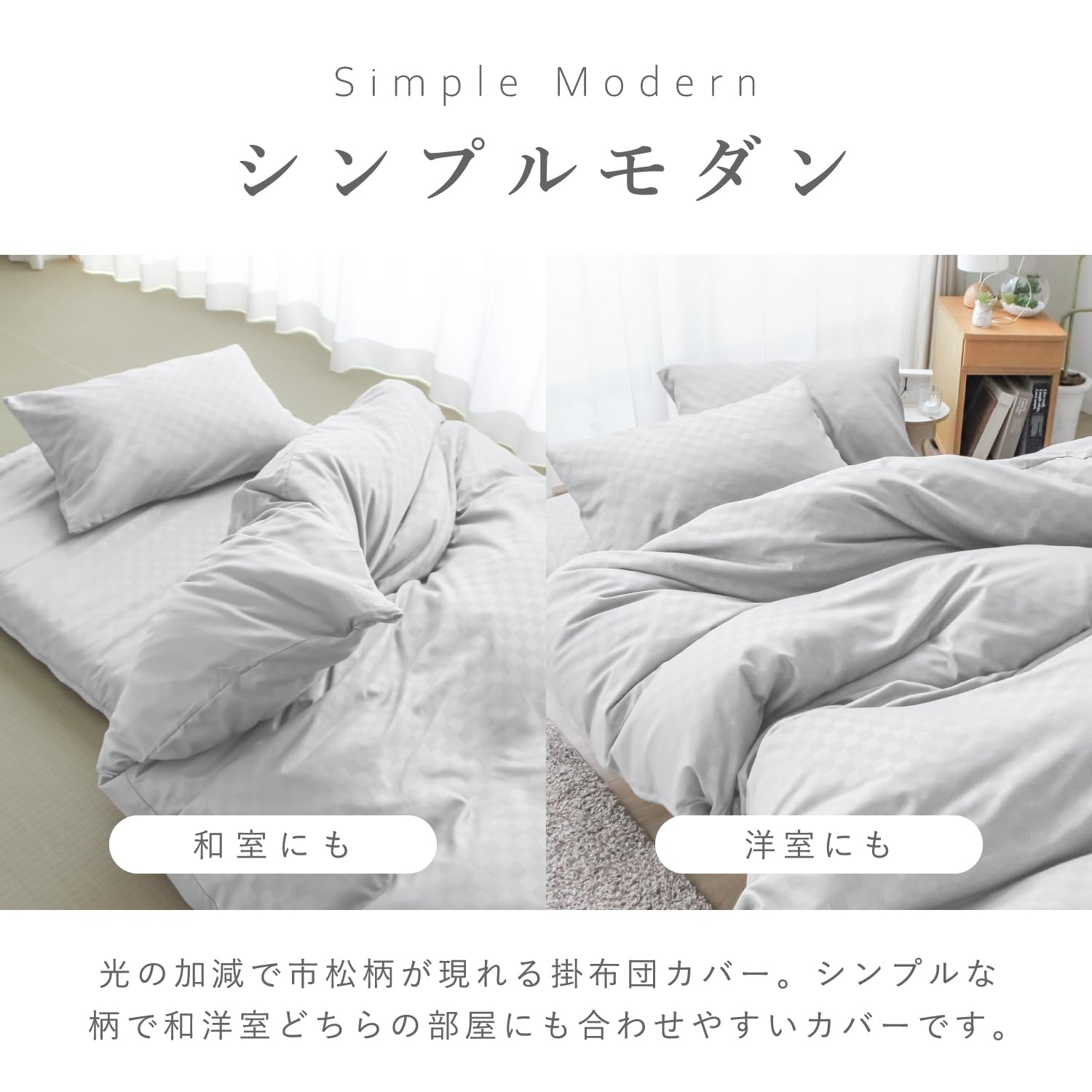 単色だが光の加減で市松柄が現れるモダンテイストの布団カバー。一見、無地のカバーにも見える柄が和洋室どちらの部屋にも合わせやすくなっています。