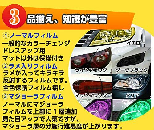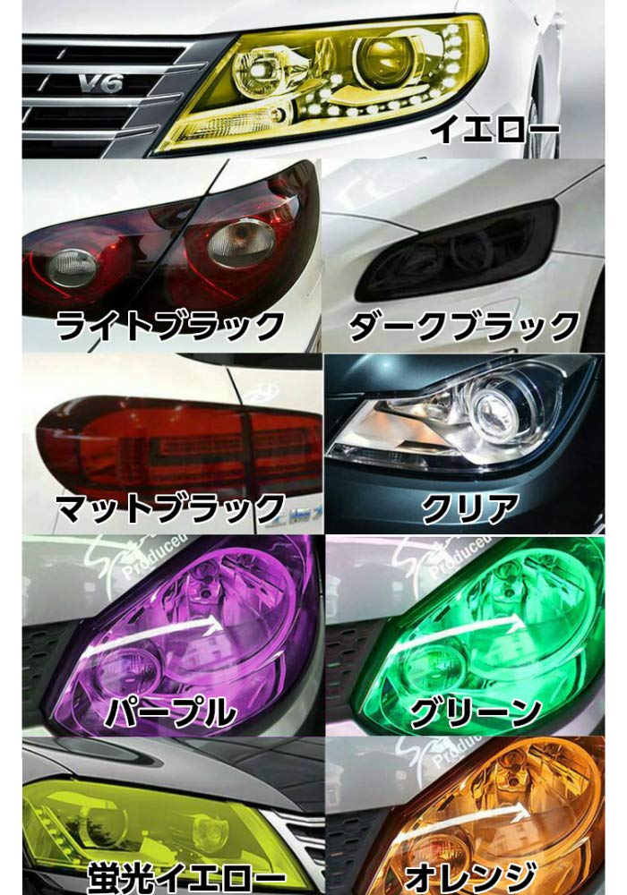 ヘッドライトやテールライトのドレスアップ用レンズフィルム 当店オリジナルブランド商品です。 ドレスアップだけでなく保護用としても活躍 曲面はヒートガン等で温めるとよく伸びるので貼り易いです。 裏面粘着シート 保護フィルム付き(マットブラック、ラメ入りを除く)