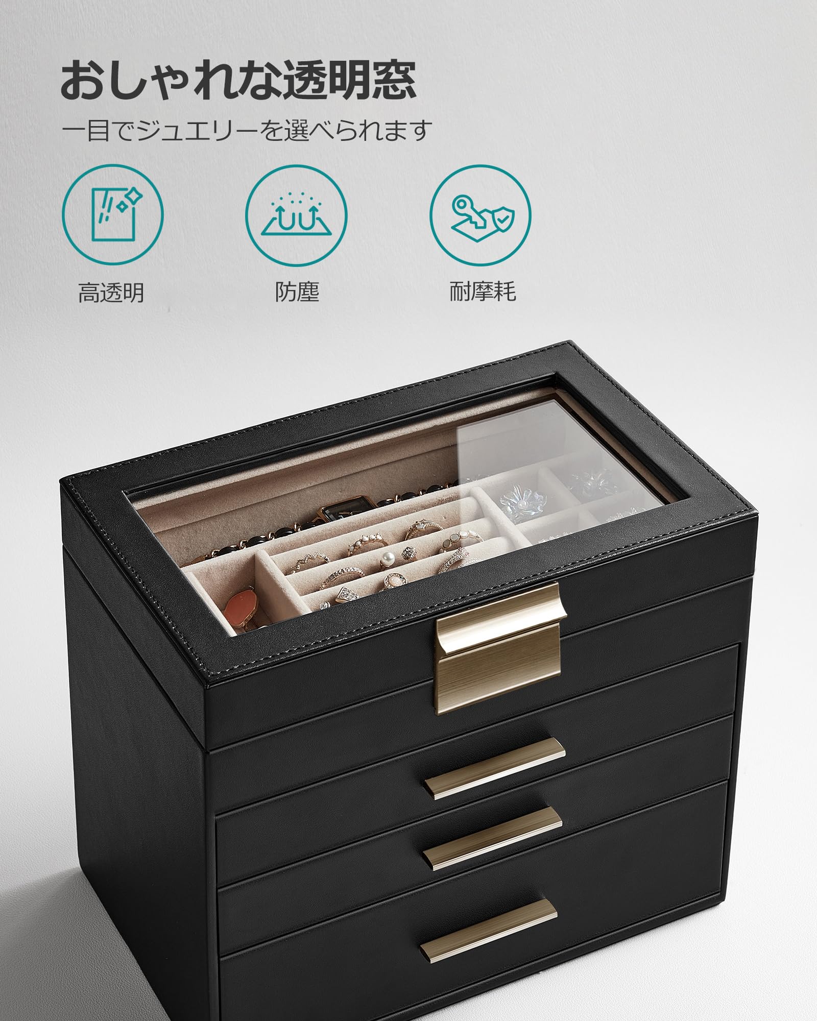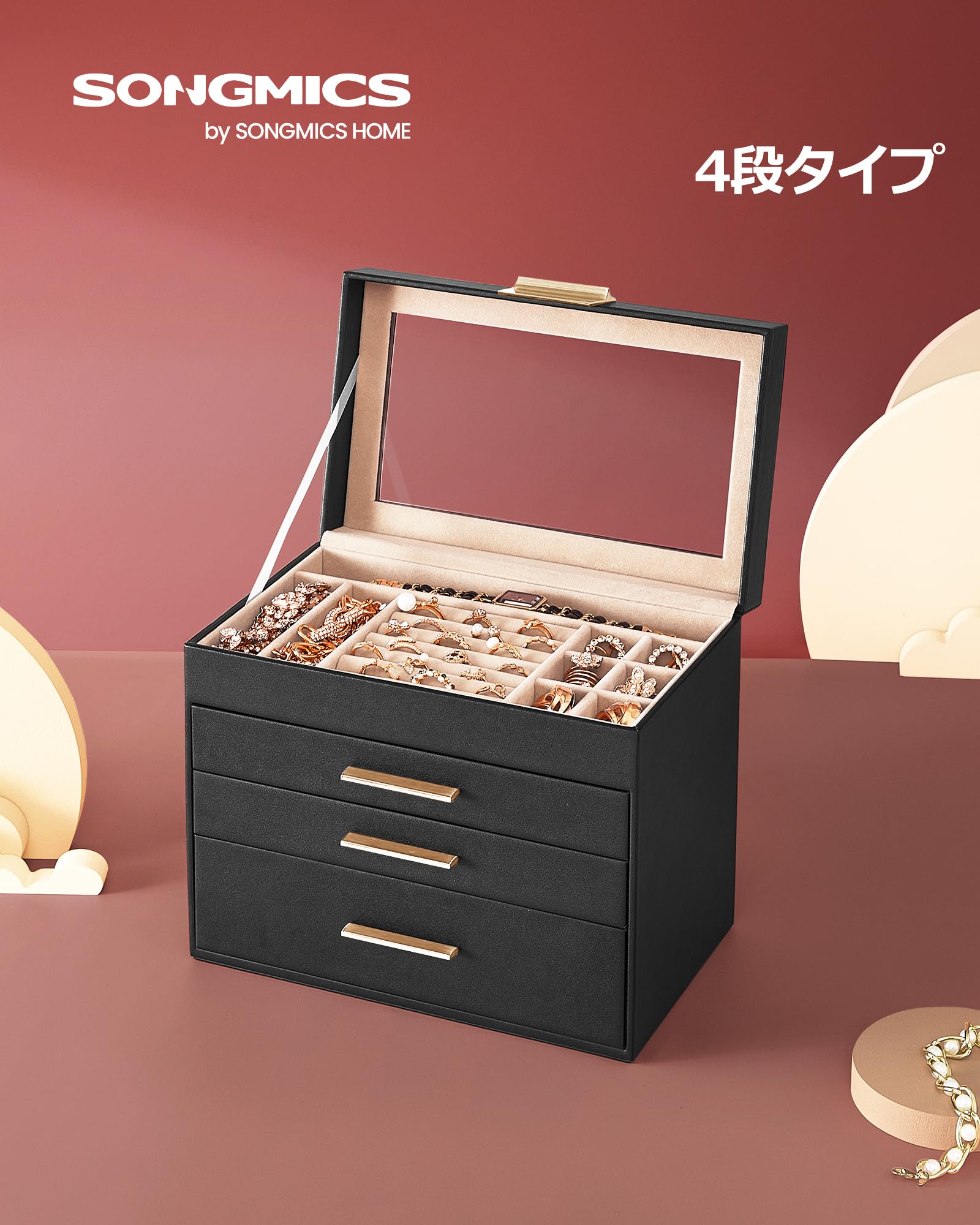 【在庫処分】SONGMICS ジュエリーボックス 大容量 アクセサリーケース 4段式 引き出し 指輪、ブレスレット収納宝石箱 ガラス蓋 母の日ギフト ブラック JBC161B02
