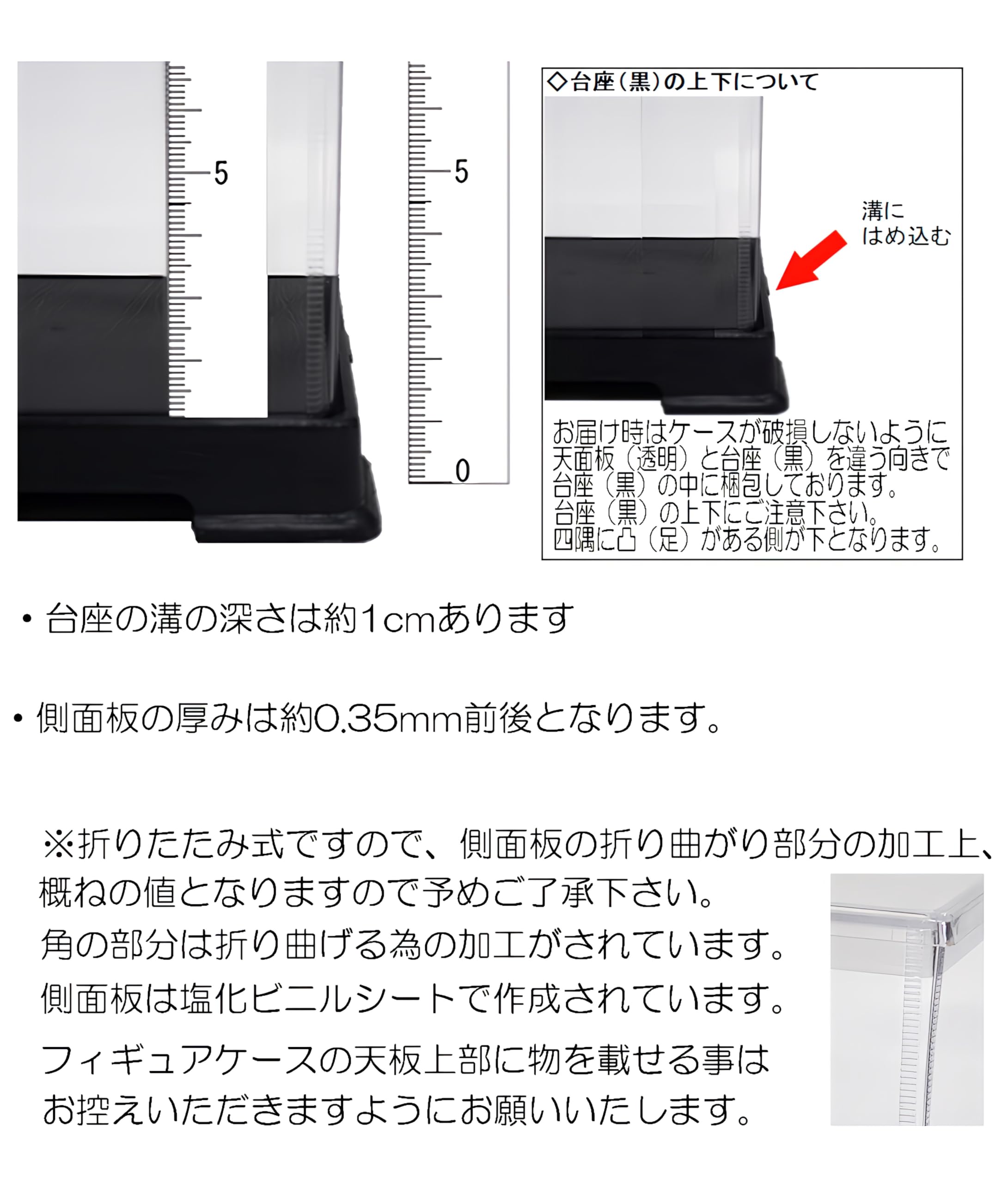 【ケースの仕様】3つのパーツ「1.天面板(透明)はプラスチック(スチロール樹脂:厚さ1mm)、2.側面板(透明)はプラスチックシート(塩化ビニル:厚さ約0.35mm) 、3.台座(黒色)はプラスチック(スチロール樹脂:厚さ1mm)」となっております。側面板(透明)はプラスチックシート(軟質)となっており、手で曲げれば曲がりますのでガラスに比べて軽くて割れにくく地震などで落下してもガラスより安全です。天板と台座は暑さ1mmのプラスチック(硬質)で硬くしっかりしております。天面板(透明)、台座(黒色)は金型に素材を流し込む丸い跡や金型からパーツを抜く際にできる型キズが入ります。ご了承ください。
