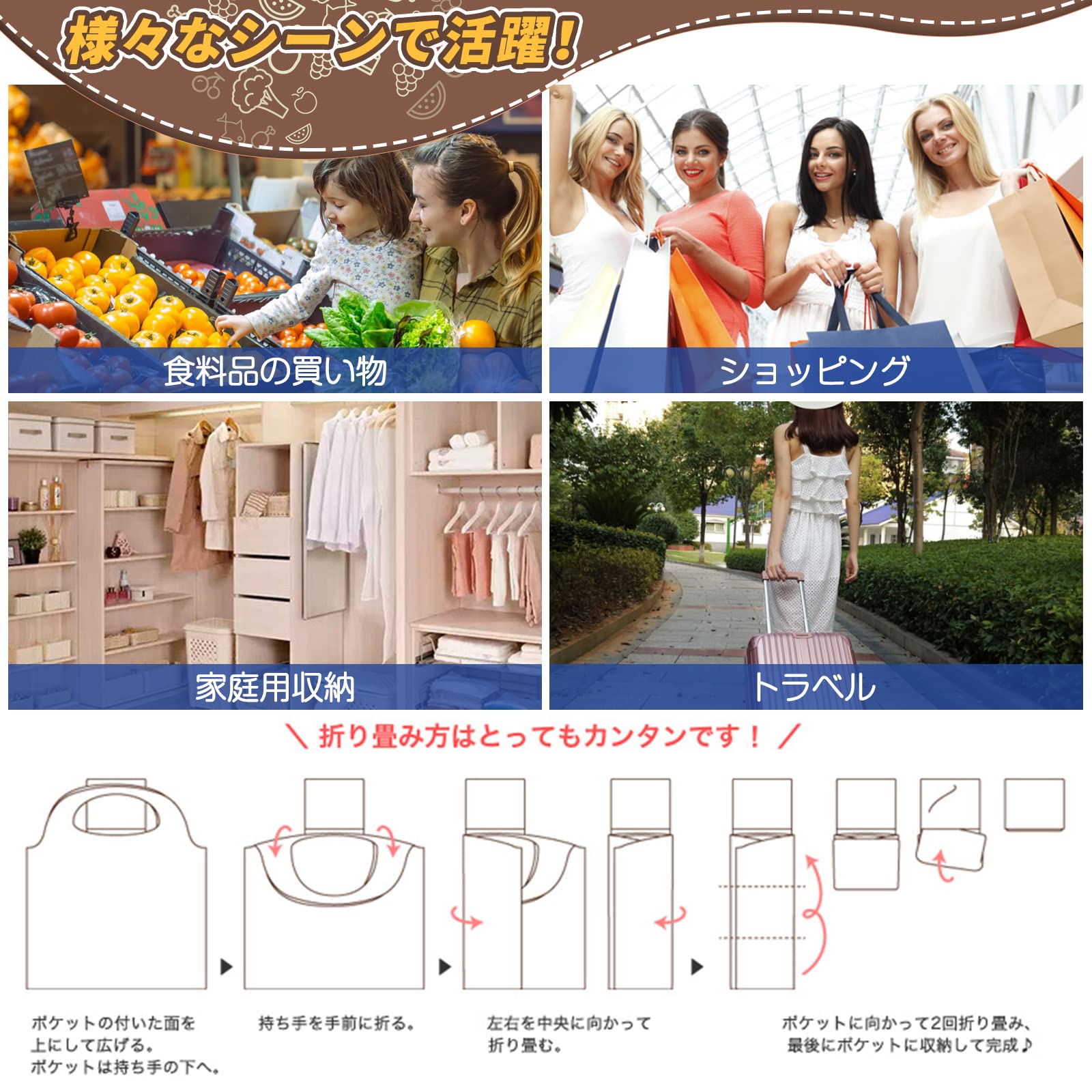 ?【収納袋付き】おしゃれにに収納できて、持ち運びにも便利なコンパクトバッグで邪魔になりません。エコバッグ自体に収納袋が付いており、収納袋が紛失してしまう恐れがありません。小さい裏袋を付き、使用完了の後、財布くらい大きさを折畳みして、裏袋に入れて、収納便利し、携帯も便利です。