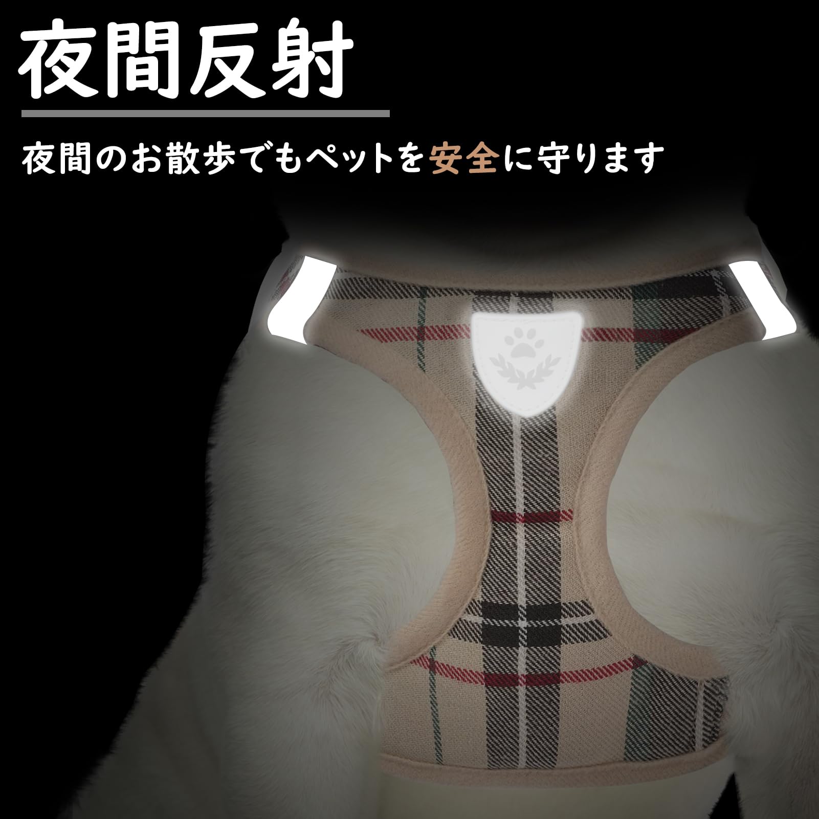 ??【夜の散歩も安心!スタイリッシュな反射デザイン】:ハーネスには両サイドとロゴ部分に反射素材が施されているため、夜の散歩でも安全性がしっかり確保できる。ワンちゃんも飼い主も、暗い道で目立つから安心。さらに、クラシックなチェック柄が洗練された印象を与え、どんなワンちゃんにもマッチする。流行に左右されないデザインなので、長く使い続けられる。