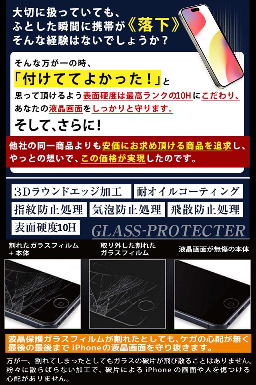 【日本旭硝子素材・最強硬度10H・飛散防止】ガラスフィルム一般的な液晶保護フィルムの約6倍の強度。衝撃は強化ガラスに吸収されますので、ディスプレイにかかる衝撃負荷を軽減し。ディスプレイが破損することを防ぎます。万が一の破損時も飛散防止加工によって破片はフィルムに張り付いた状態で破片がほとんど飛び散らない安全性の高いガラスになっています。