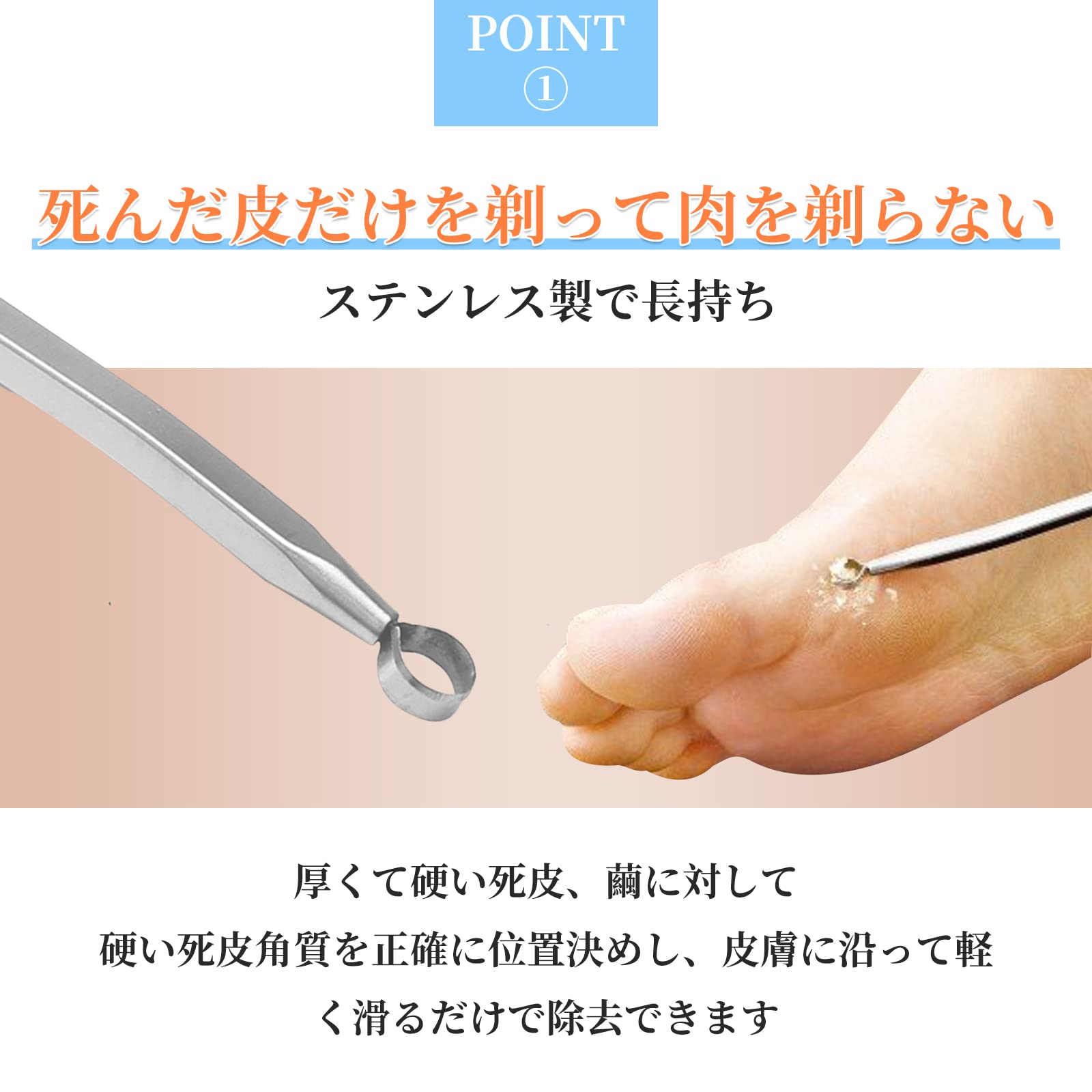 【角質リムーバー 使い方】 足をお湯で十分15〜30分間ぐらいふやかします。入浴や足浴などでお手入れをしたい箇所をよくふやかして、角質を柔らかくしておくのがポイント。削るときは肌に水平にあて、一定方向に動かし削ってください。使用後は水洗いをして乾燥させてください。耐水性にすぐれたステンレスを採用し、濡れた状態の足や、濡れた床など、水に濡れるような環境化でも使用できます。