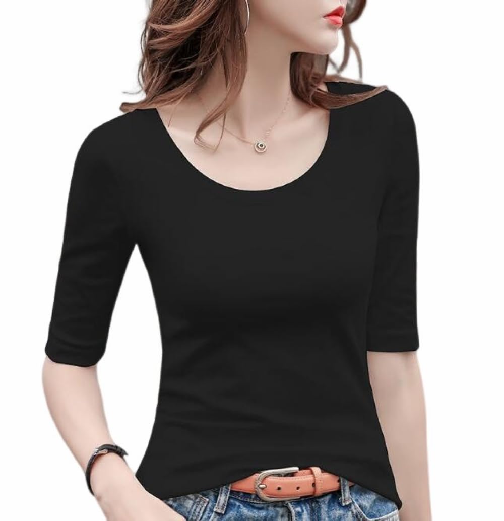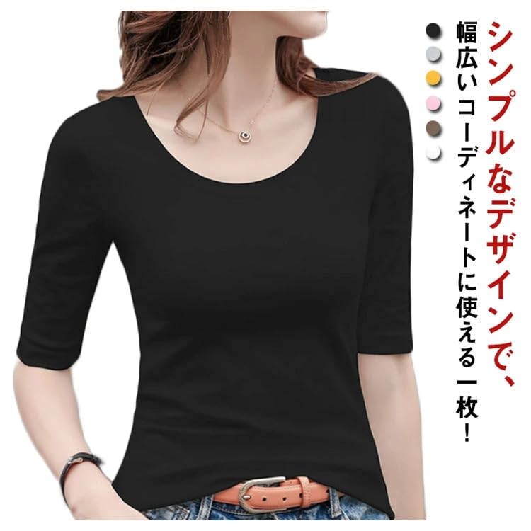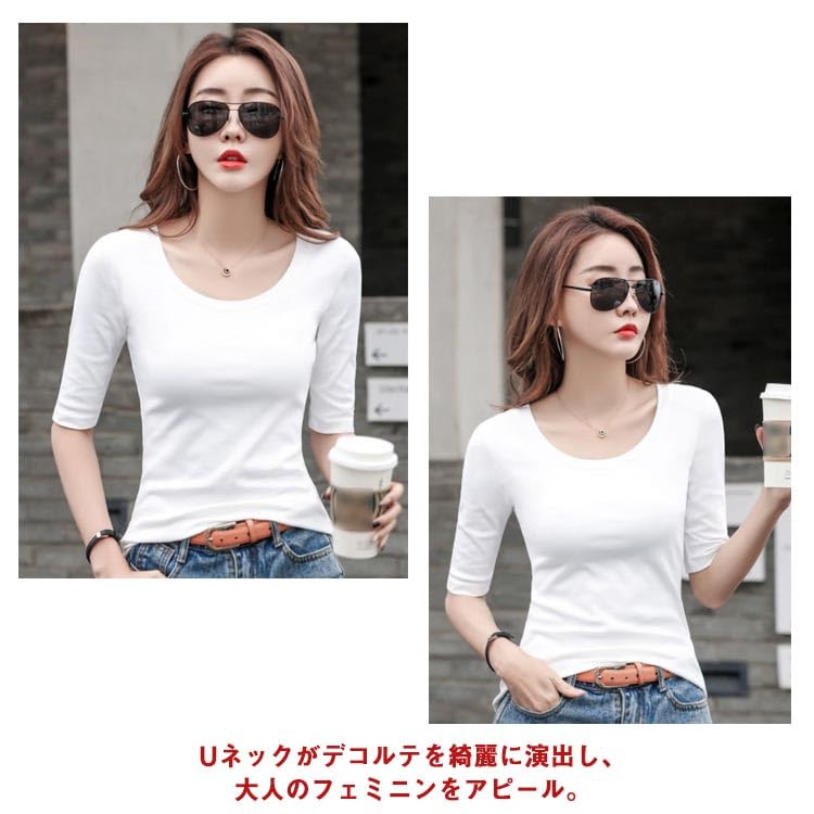 【新着商品】5分袖Tシャツ Tシャツ カットソー Uネック 春秋 夏 ストレッチ レディース トップス 綿 コットン 5分袖 タイト tシャツ 無地 スリム インナー シンプル カジュアル