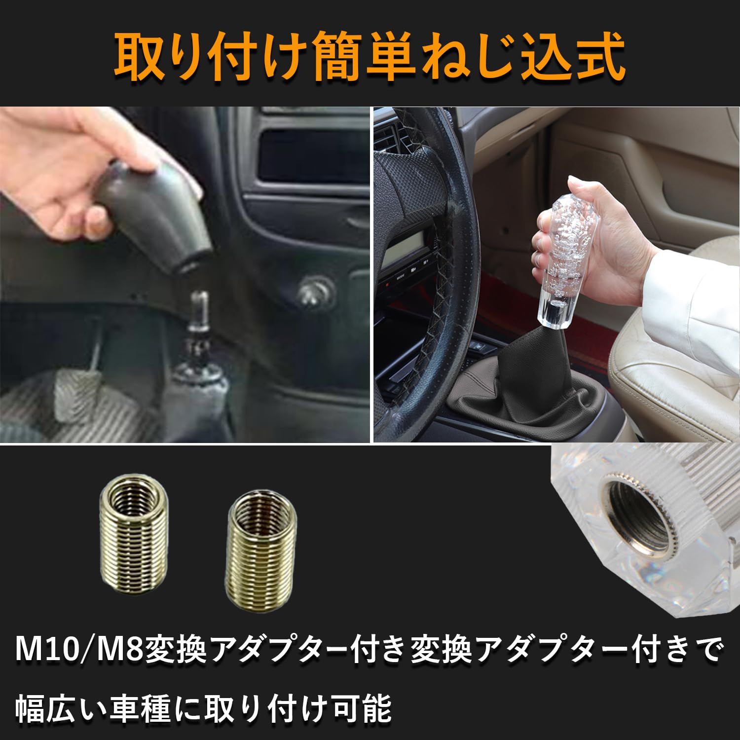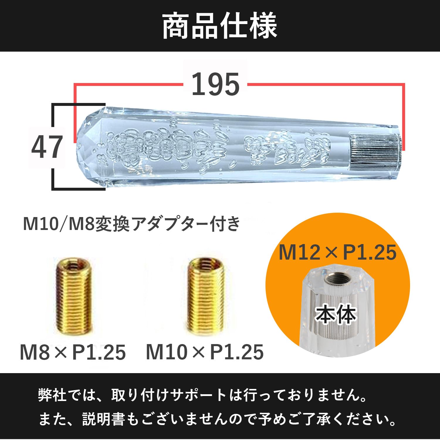 ただのクリスタル シフトノブデザインでなく泡入り(バブル)のため、飽きがきにくいデザインとなっています。 また、変換アダプター付きでネジ穴M10、M8サイズにも取り付け可能です。本体サイズはM12となっています。ネジピッチは1.25mm。
